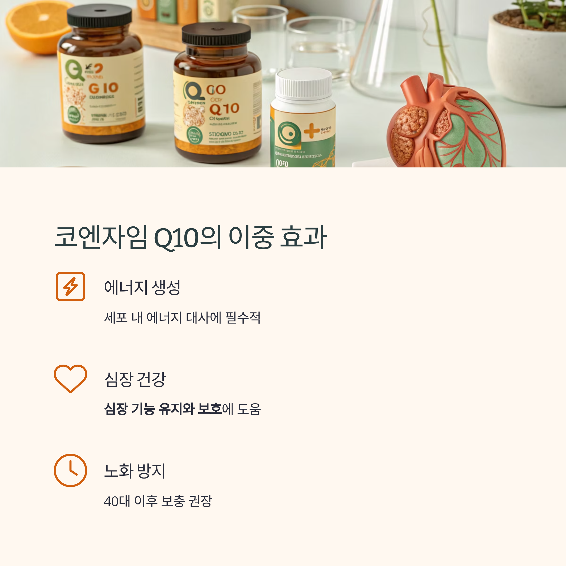 | 코엔자임 Q10 | 에너지 대사+항산화 | 심장 건강, 노화 예방 | 100~200mg |