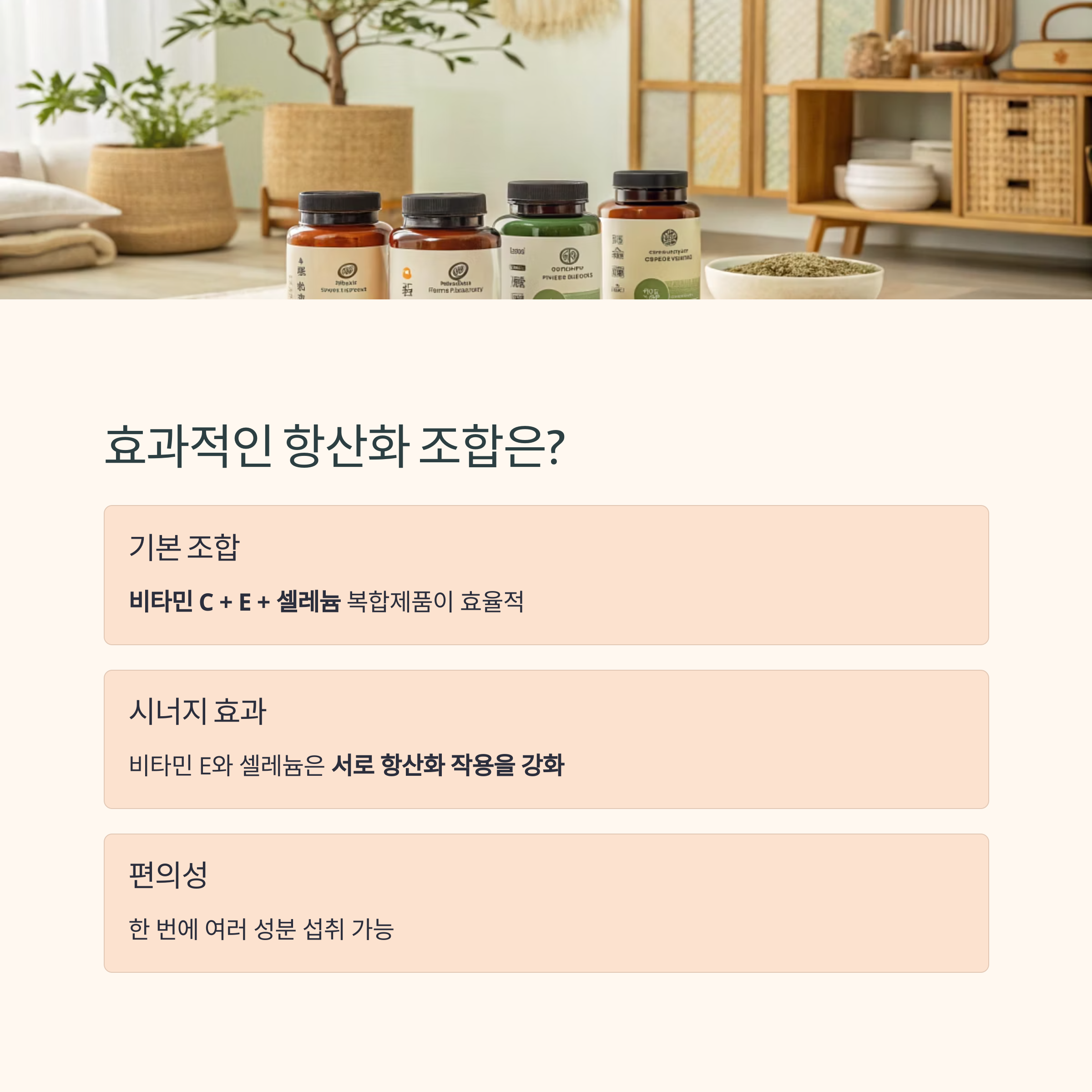 이런 분들은 비타민 C + E + 셀레늄이 한 번에 들어간 복합 제품을 고르는 것이 효율적입니다