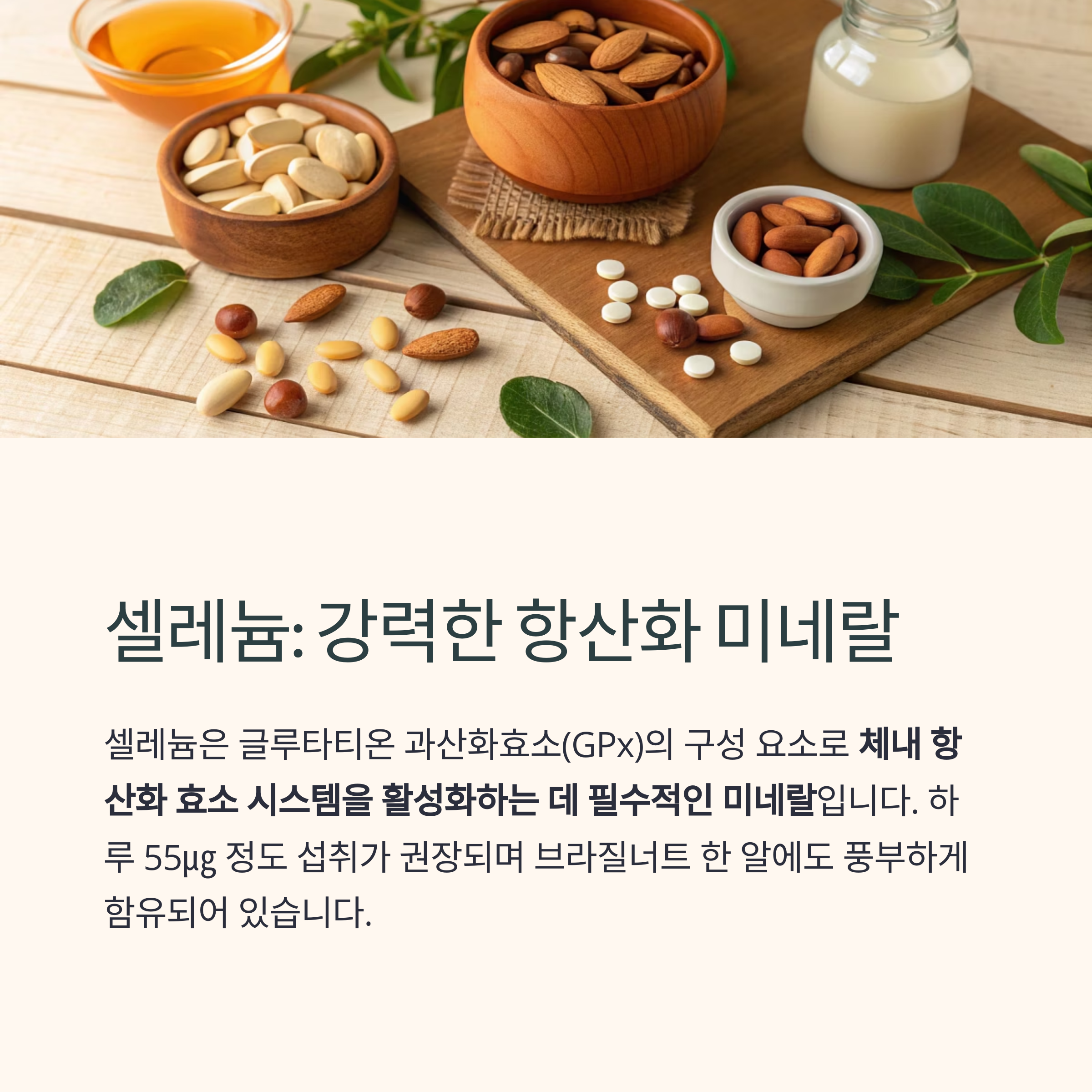 | 셀레늄 | 미네랄 | 항산화 효소 활성화 | 55~100㎍ |