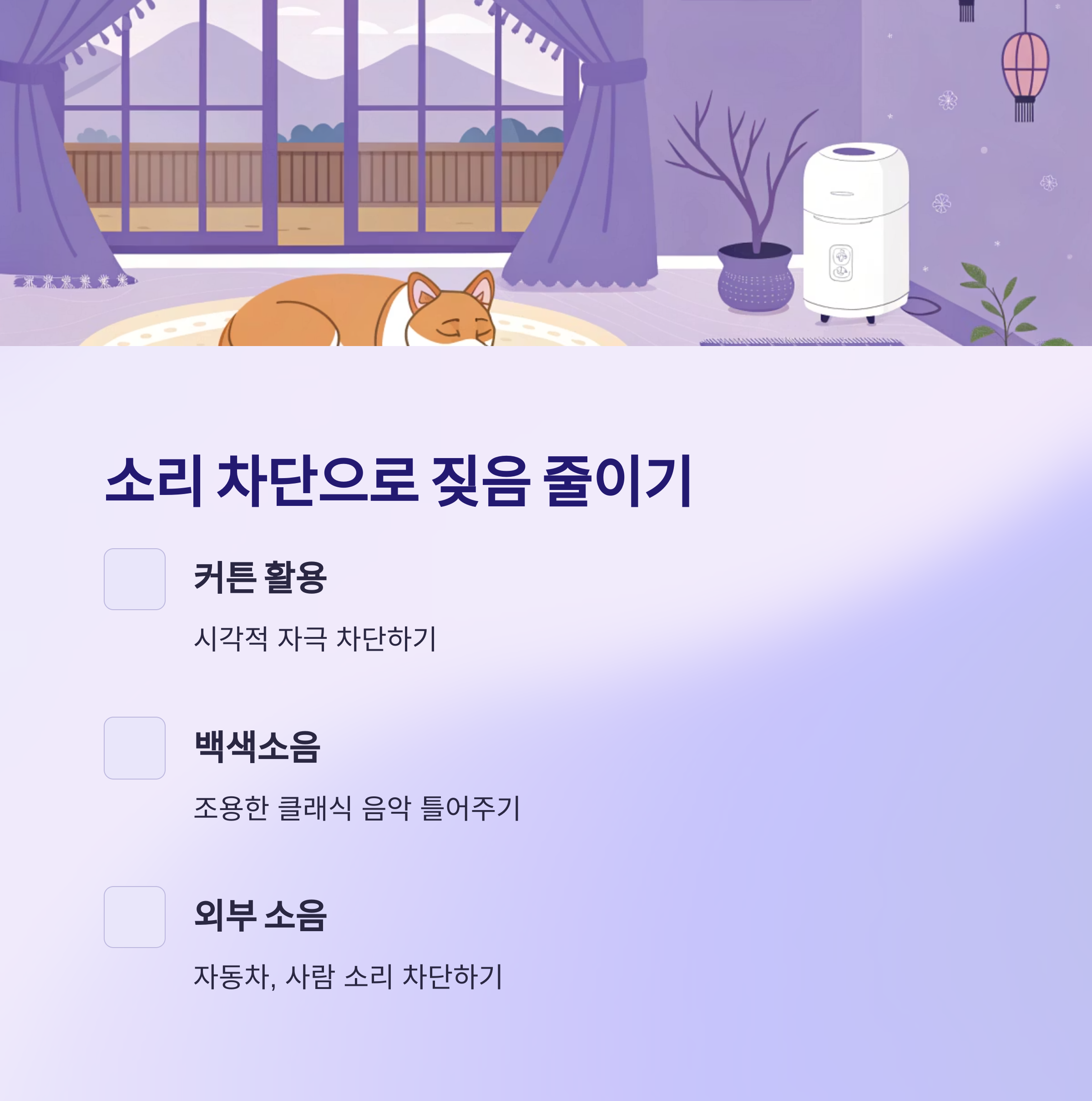 분리불안 강아지들은 외부 자극에 민감하게 반응합니다. 창밖의 자동차 소리, 사람 목소리 등에 짖기 시작하면 더 불안해집니다. 커튼을 쳐서 시각 자극을 줄이고, 백색소음기나 조용한 클래식 음악을 틀어주는 것도 효과적입니다.