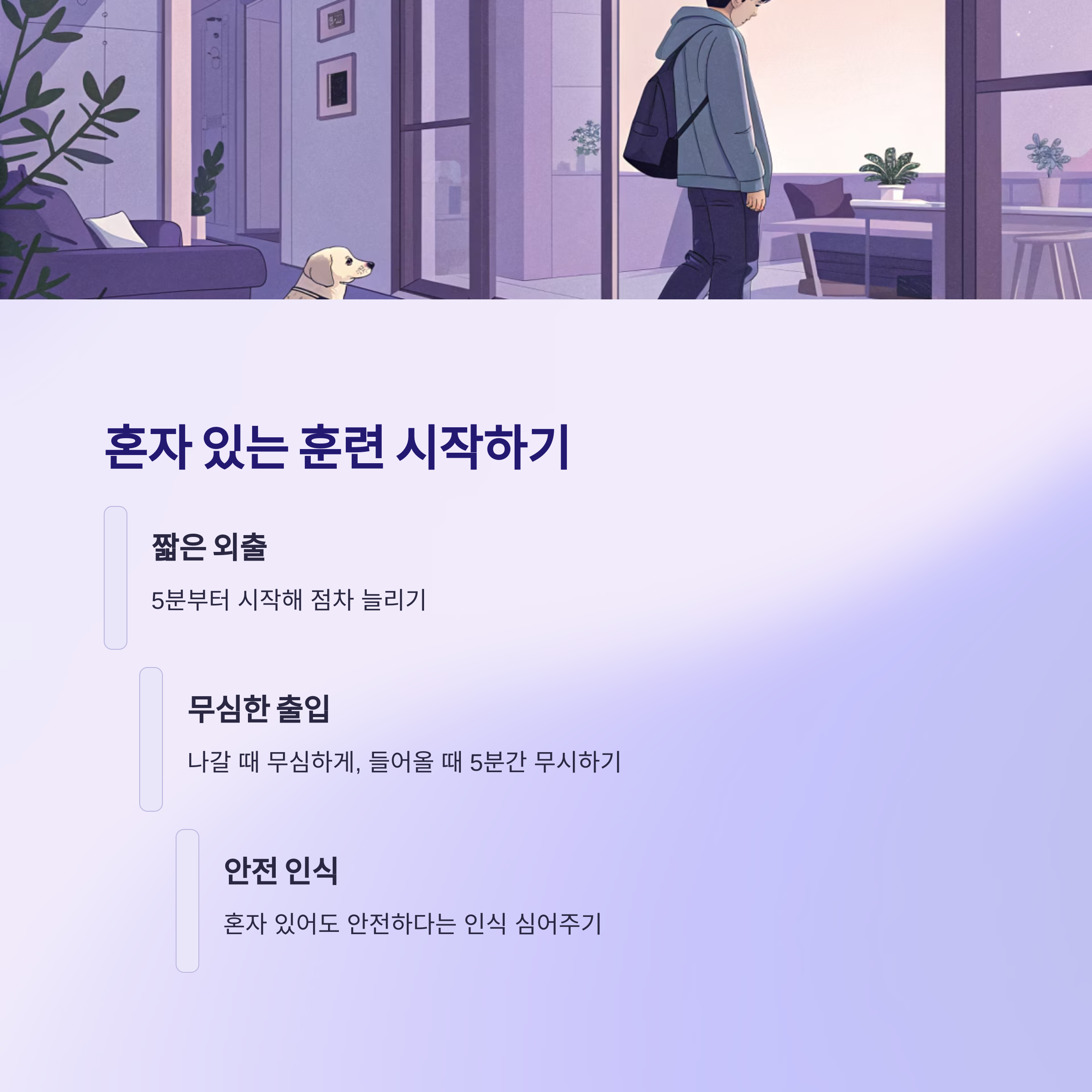 처음부터 장시간 혼자 있게 하면 오히려 더 큰 스트레스를 줄 수 있습니다. 외출 시간을 5분, 10분, 15분… 점점 늘려가며 강아지가 혼자 있어도 안전하다는 인식을 갖게 해야 합니다. 외출 시 무심하게 나가고, 귀가 후 반가워도 5분 정도는 무시하는 게 좋습니다.