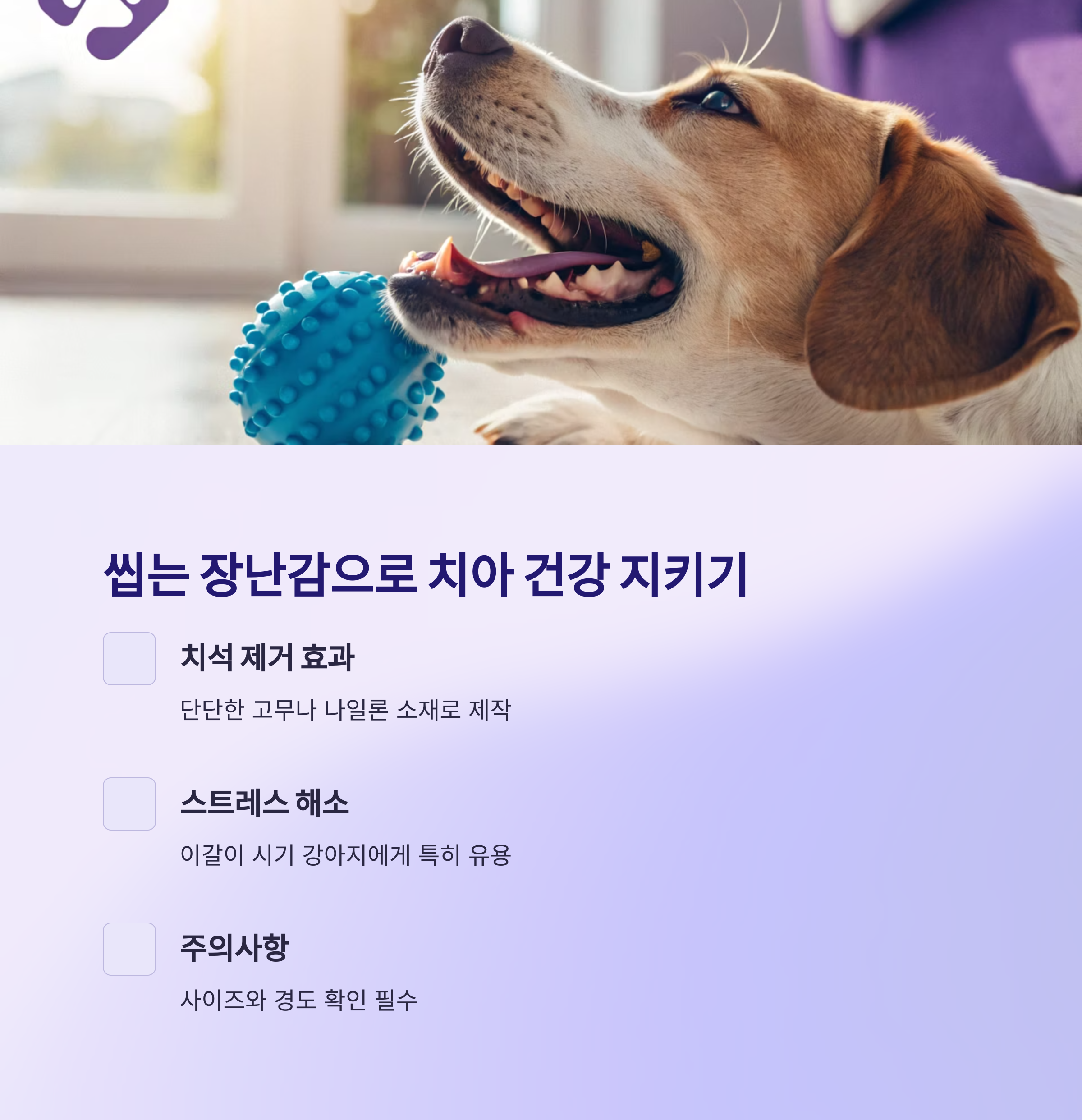 | 씹는 장난감 | 치아 건강, 스트레스 해소 | 이갈이 시기, 파괴욕 강한 견종 |