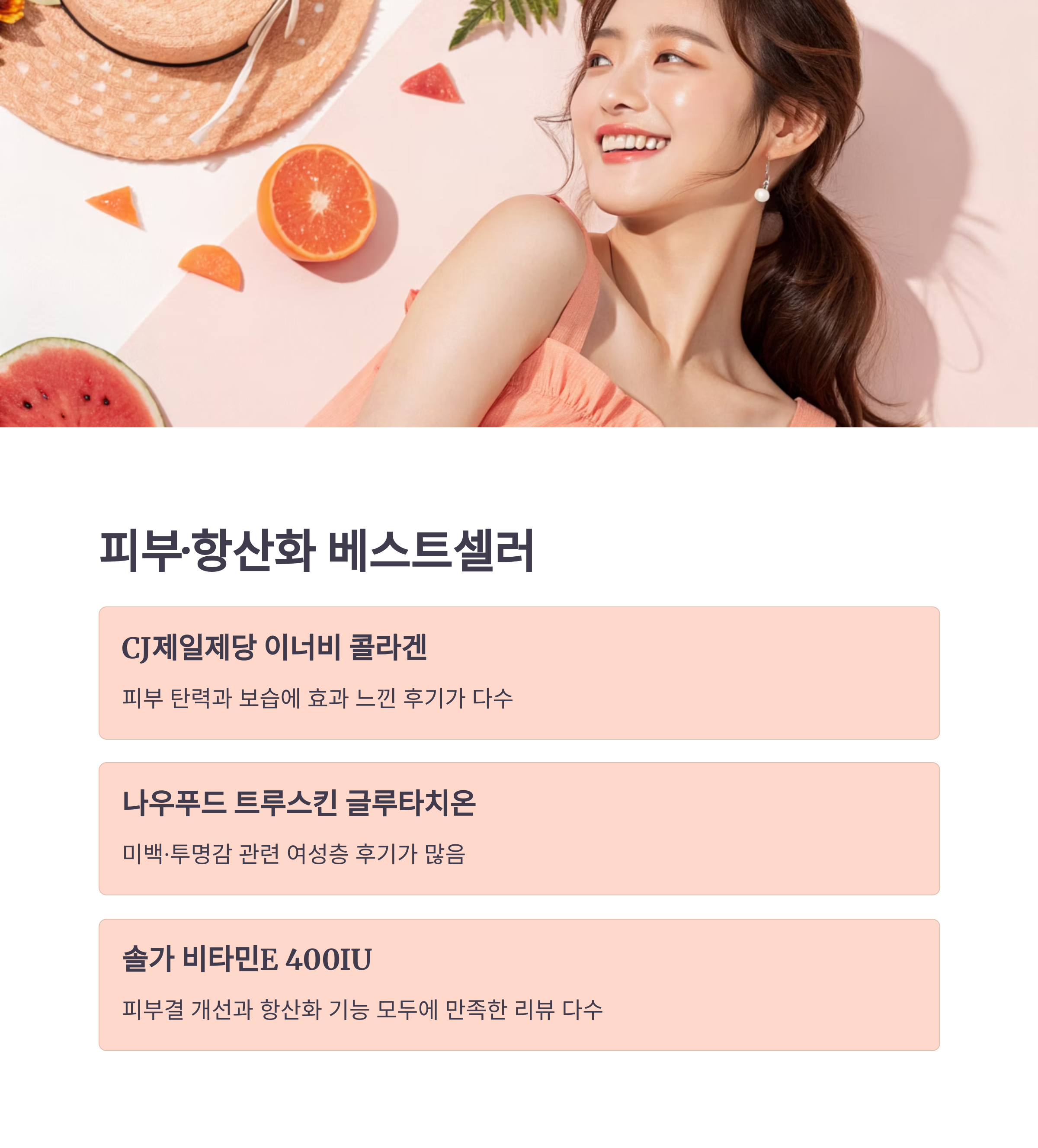 | 비타민E 400IU | 솔가 | 피부결 개선과 항산화 기능 모두에 만족한 리뷰 다수 |