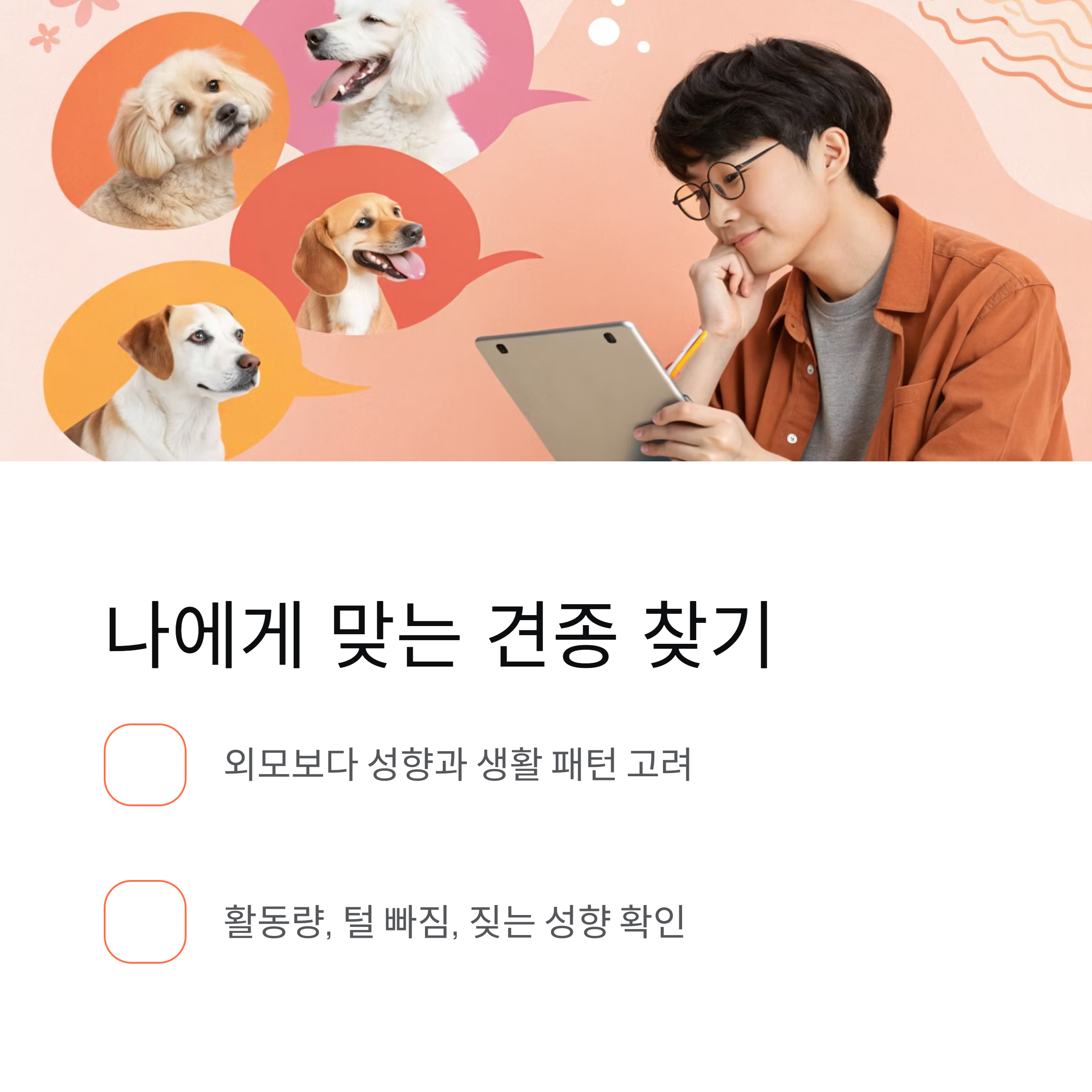 견종마다 성격, 활동량, 털 빠짐, 짖는 성향 등이 다릅니다.