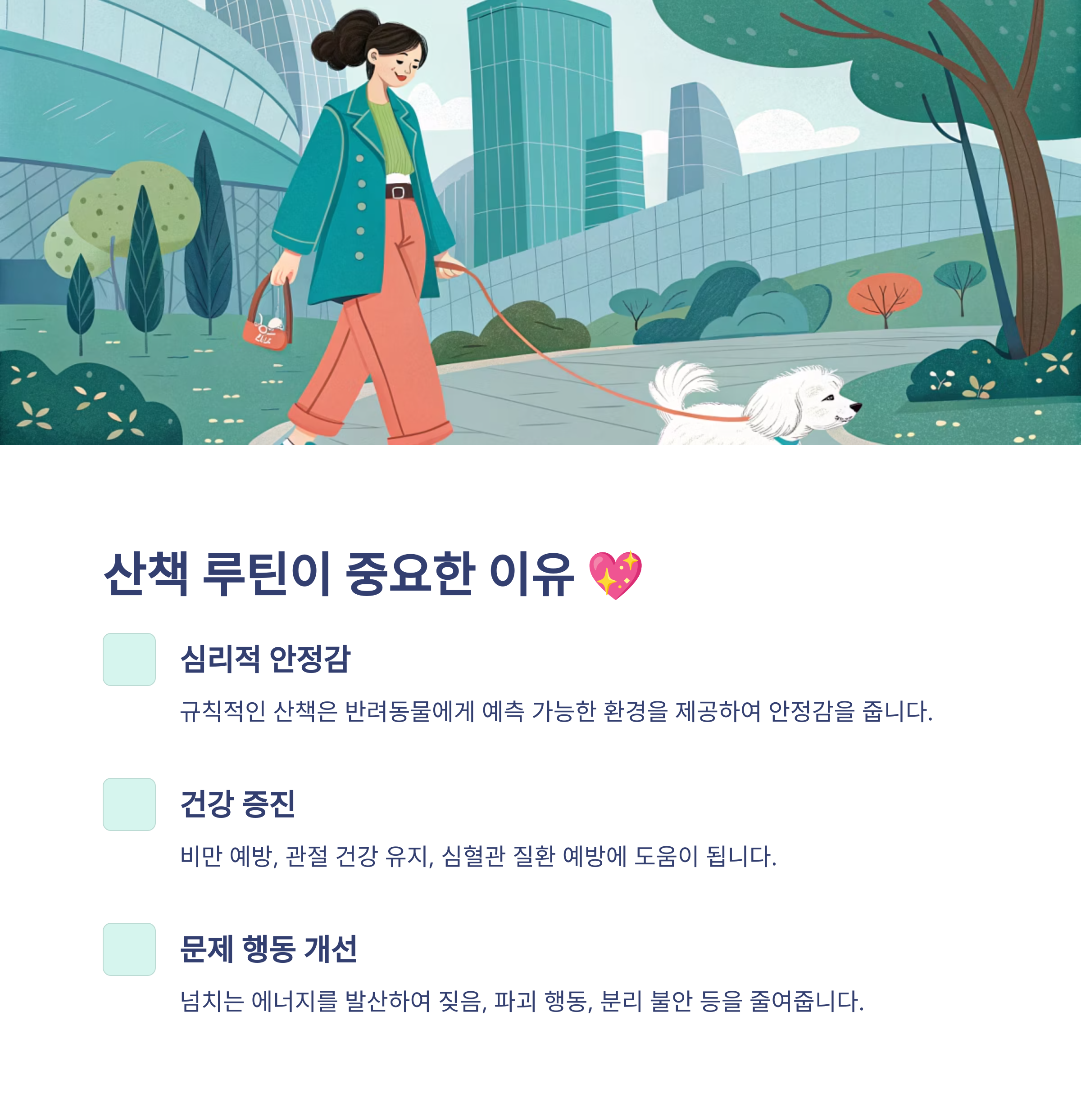 - 산책 루틴의 중요성: 반려동물에게 안정감을 주고, 신체 및 정신 건강 증진, 문제 행동 개선, 사회성 발달, 유대감 강화에 필수적입니다.