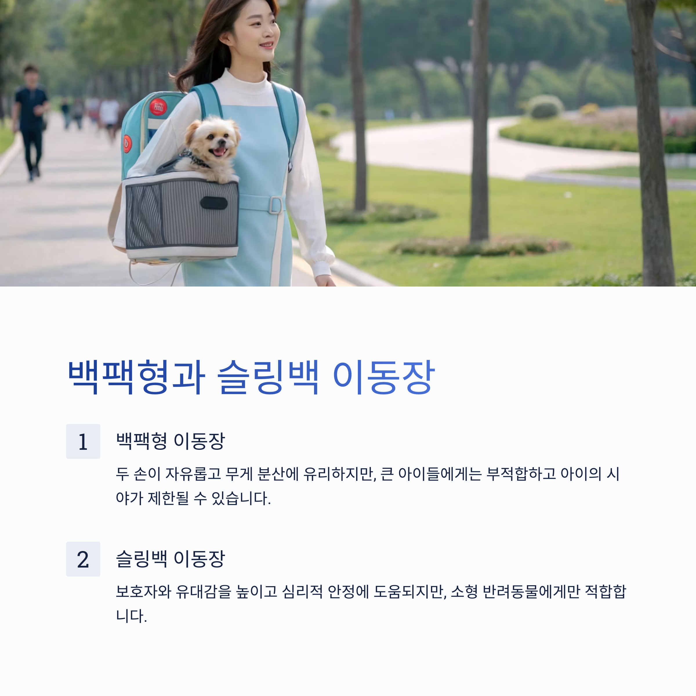 1. 다양한 이동장 종류: 하드/소프트 캐리어, 백팩형, 슬링백/크로스백, 켄넬 등 각기 다른 장단점을 가지고 있습니다.