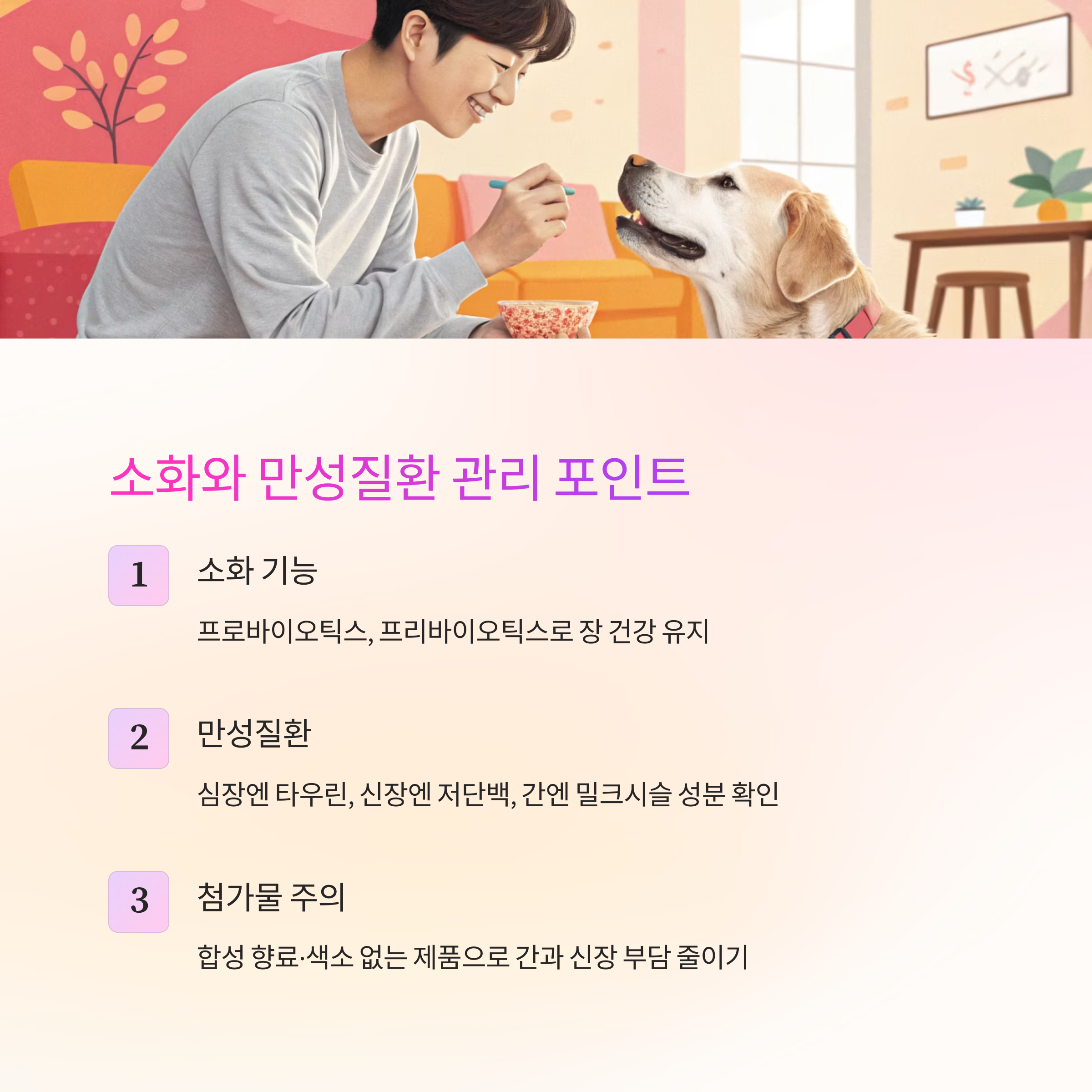 노령견은 간과 신장 해독 기능이 떨어지므로 화학 첨가물에 더 민감합니다.