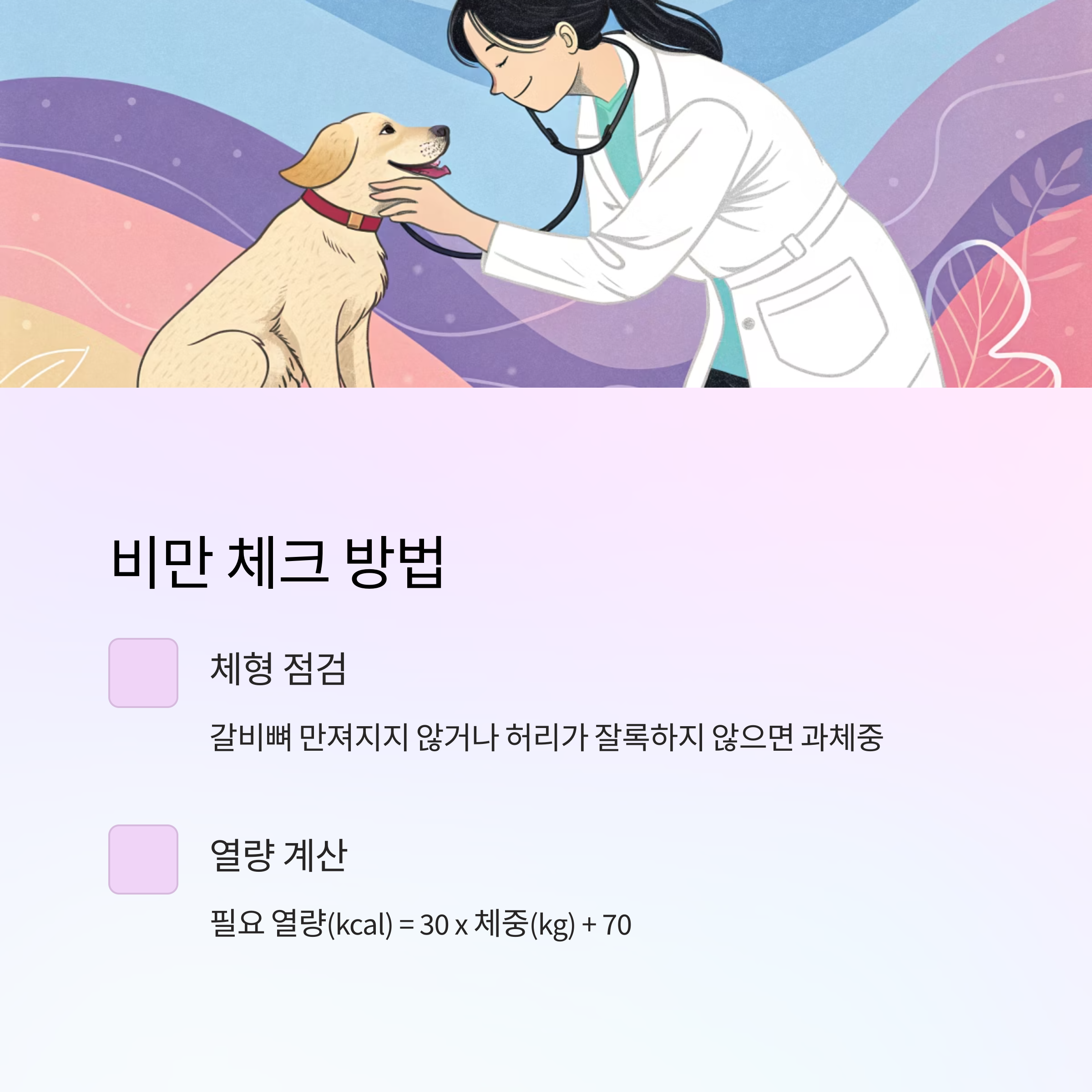 비만 여부는 체중만으로 판단하기 어렵고, 체형(BCS) 점검이 필요합니다.