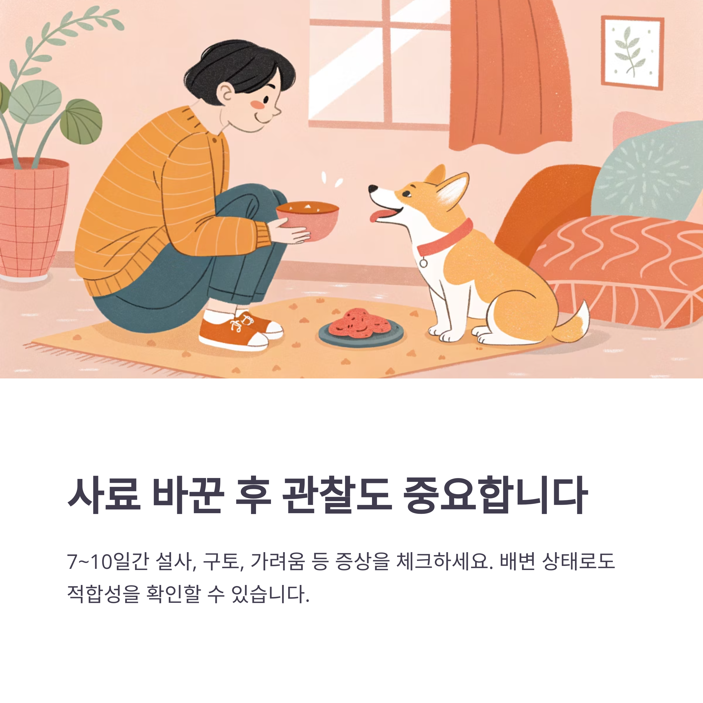 사료를 바꾼 뒤에는 설사, 구토, 가려움 등의 증상이 있는지