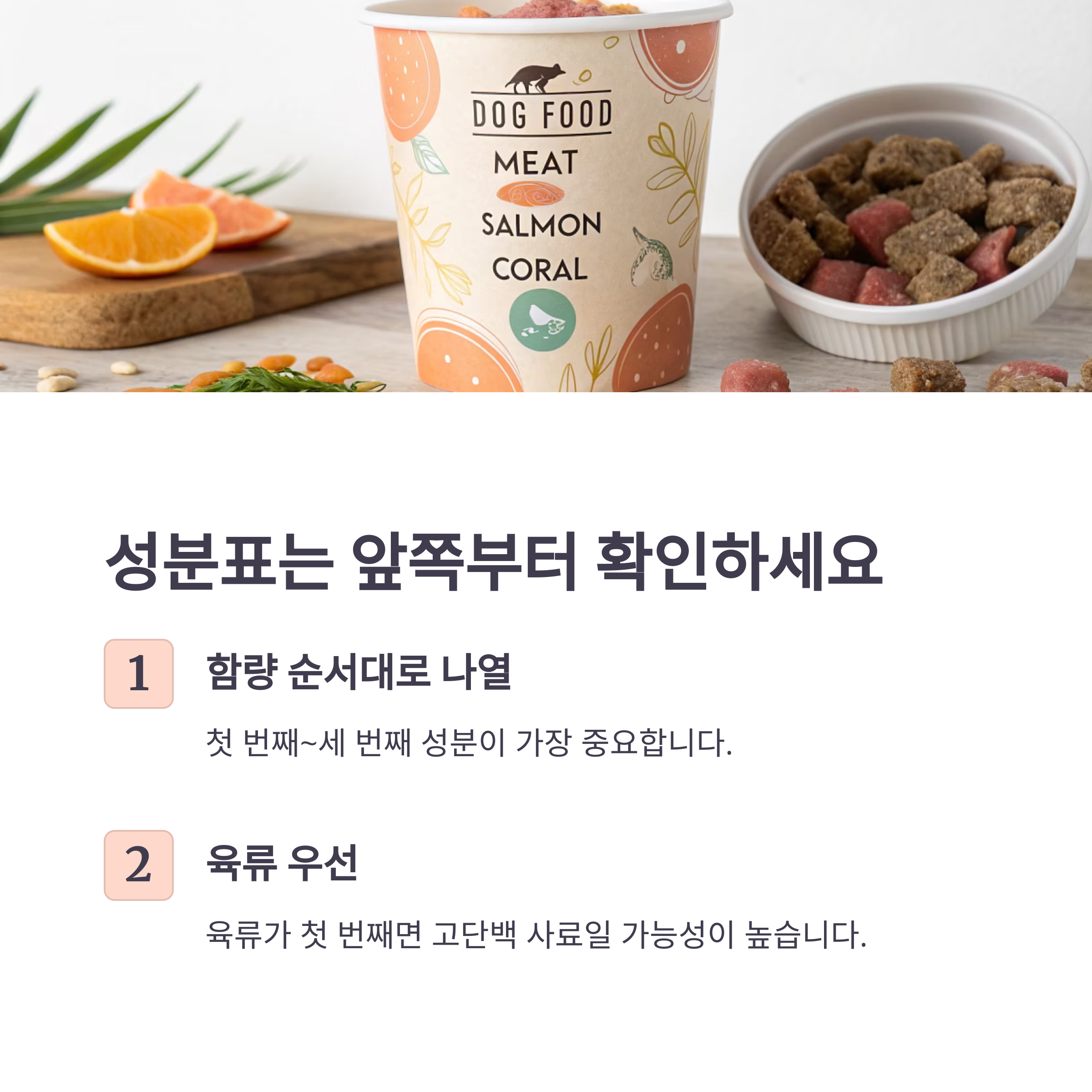 육류가 가장 앞에 있어야 고단백 사료일 가능성이 높습니다.