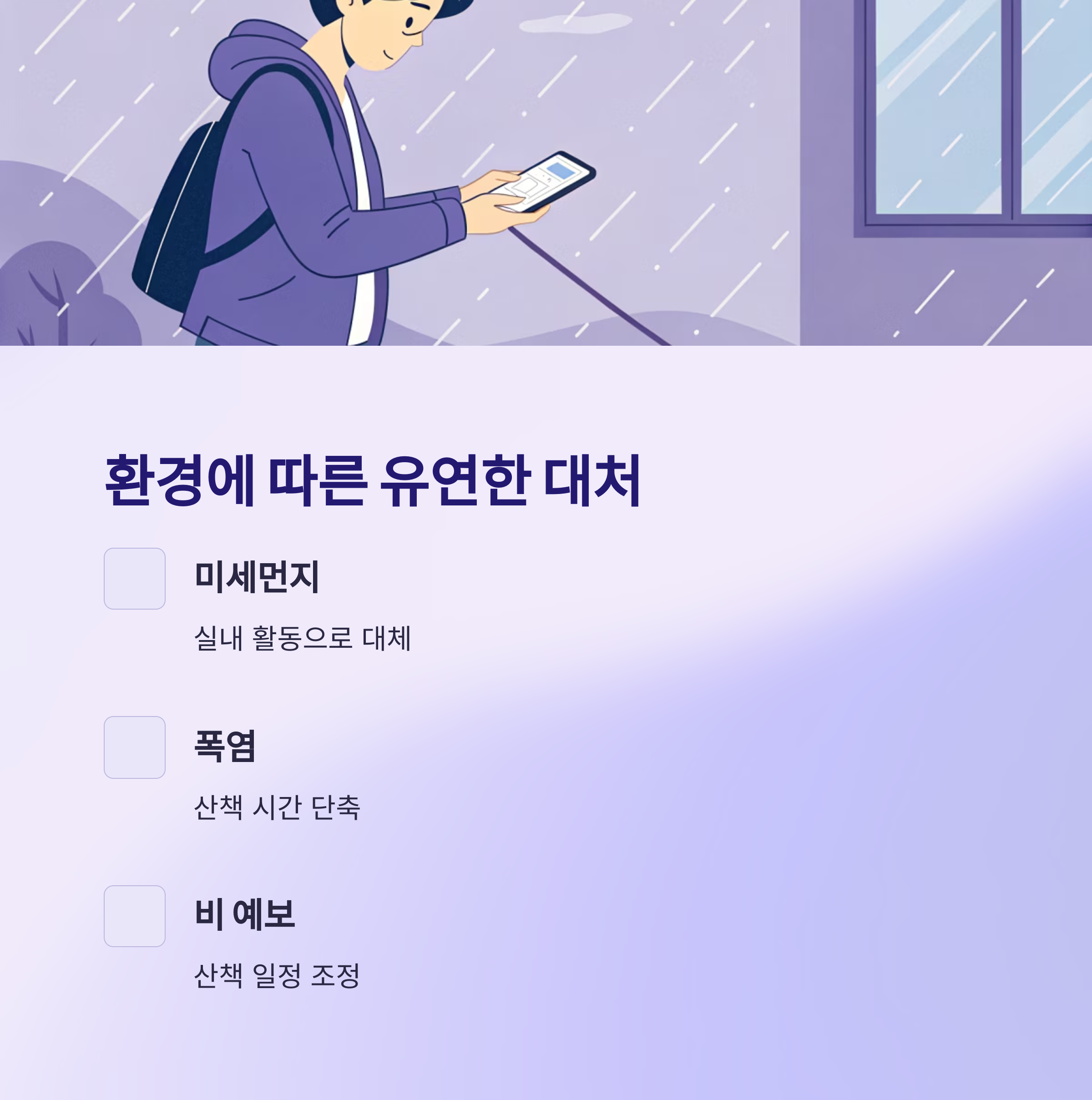 미세먼지 수치, 폭염 경보, 비 예보 등이 있다면 산책을 연기하거나