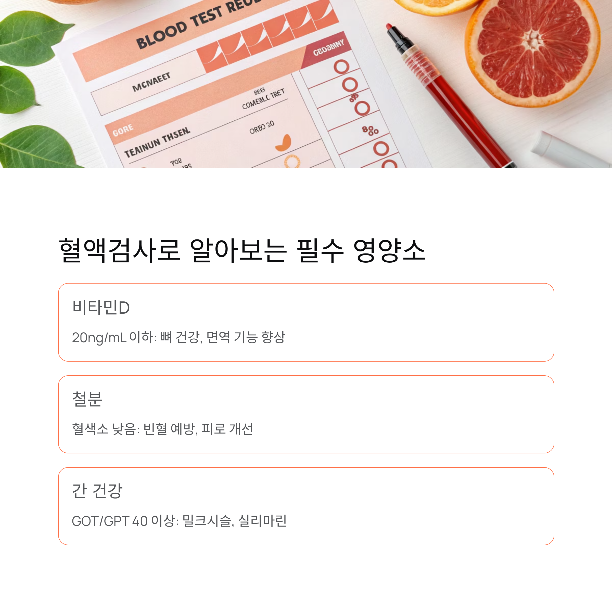 혈액 수치 중 비타민D, 철분, 중성지방, 혈당, 간수치(GOT/GPT)는