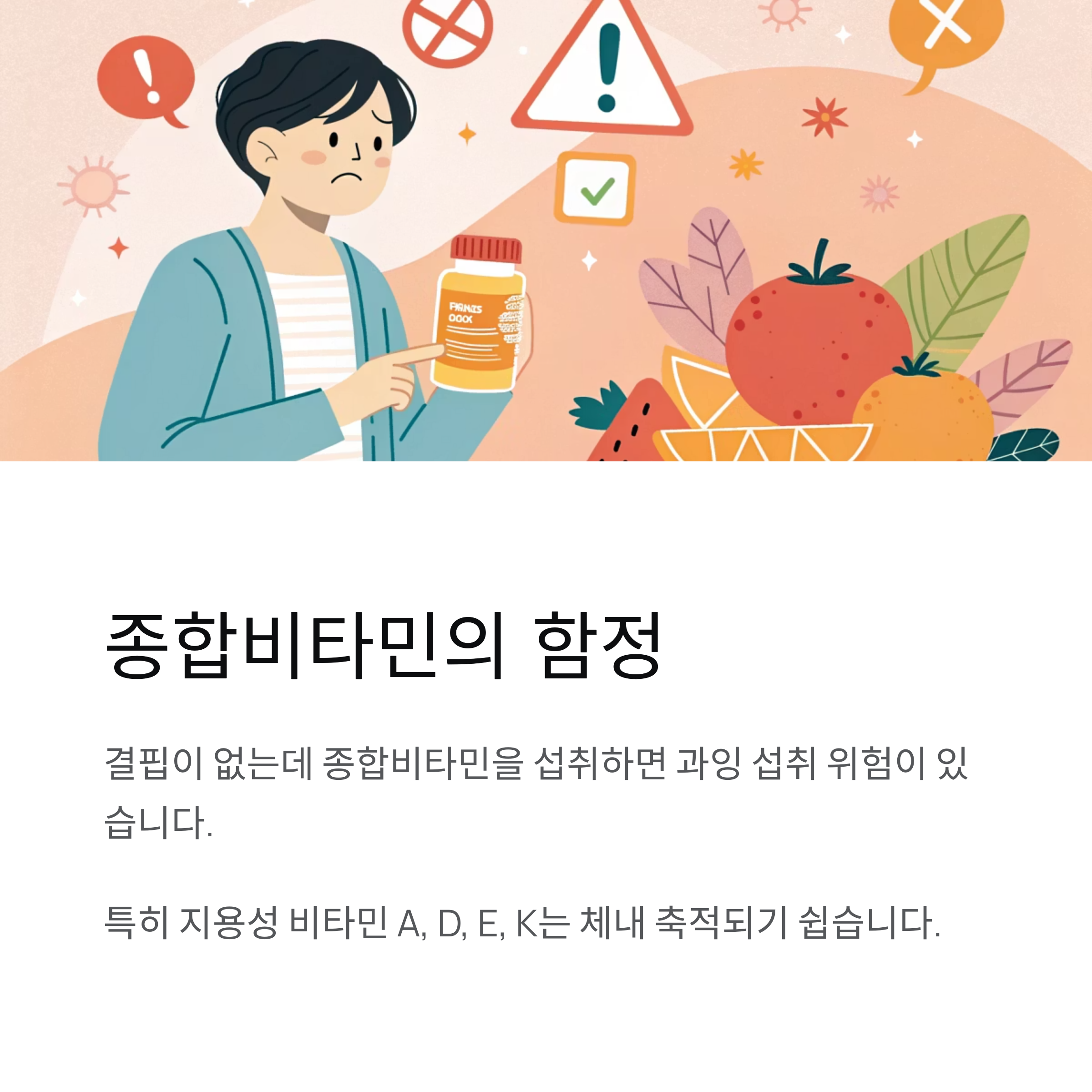 무턱대고 종합비타민을 섭취하는 것은 오히려 과잉 섭취의 위험이 있습니다