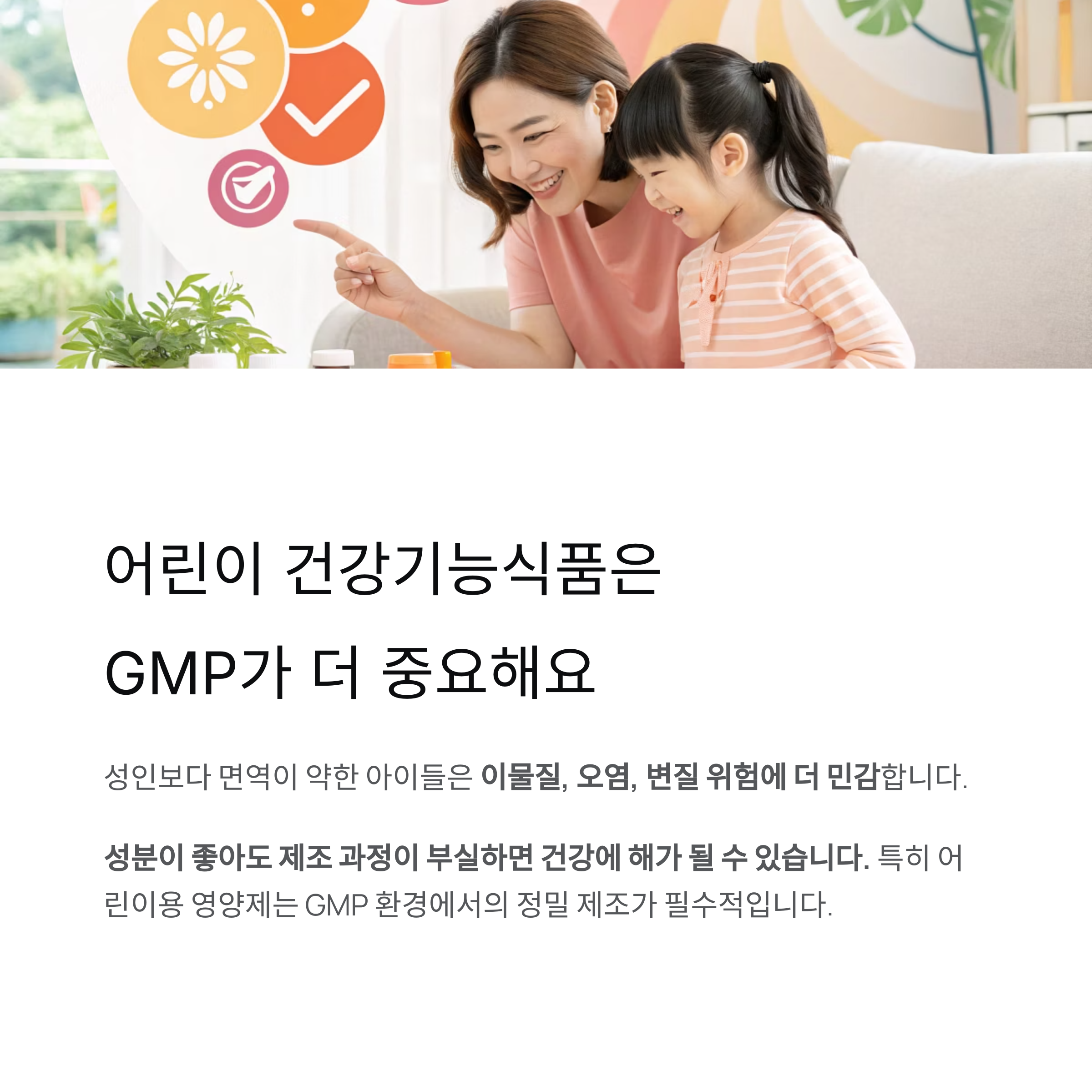 성인보다 면역이 약한 아이가 복용하는 제품일수록 이물질, 오염, 변질 위험에 민감합니다