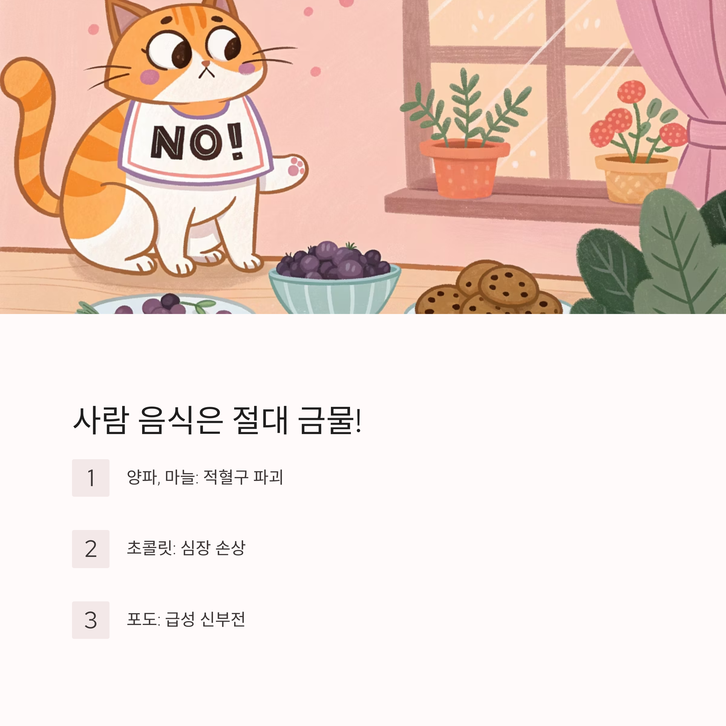 양파, 마늘, 초콜릿, 포도는 고양이에게 치명적인 독이 될 수 있으며
