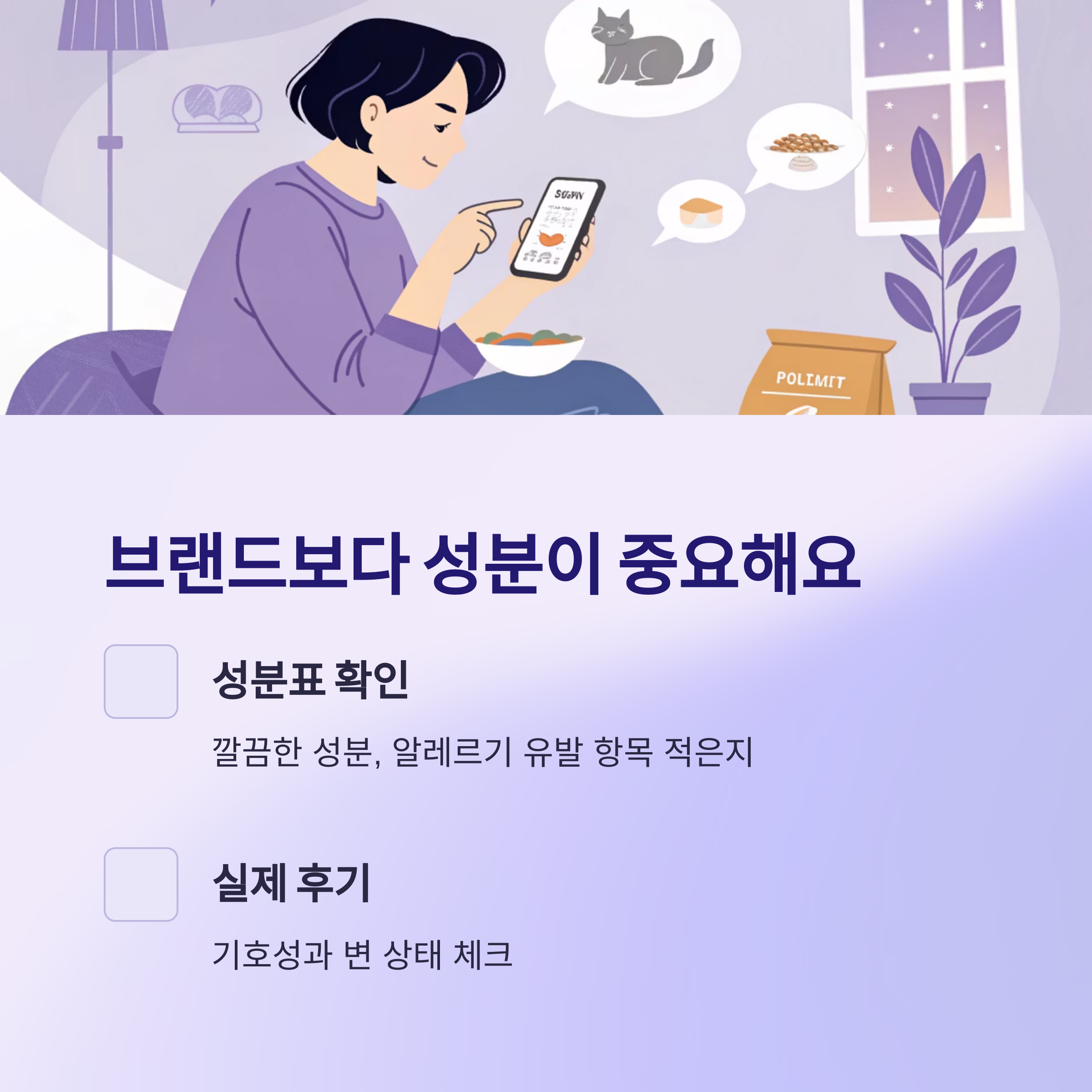 주된 단백질원이 육류인지, 곡물 비중이 높은지 등을 체크하세요.