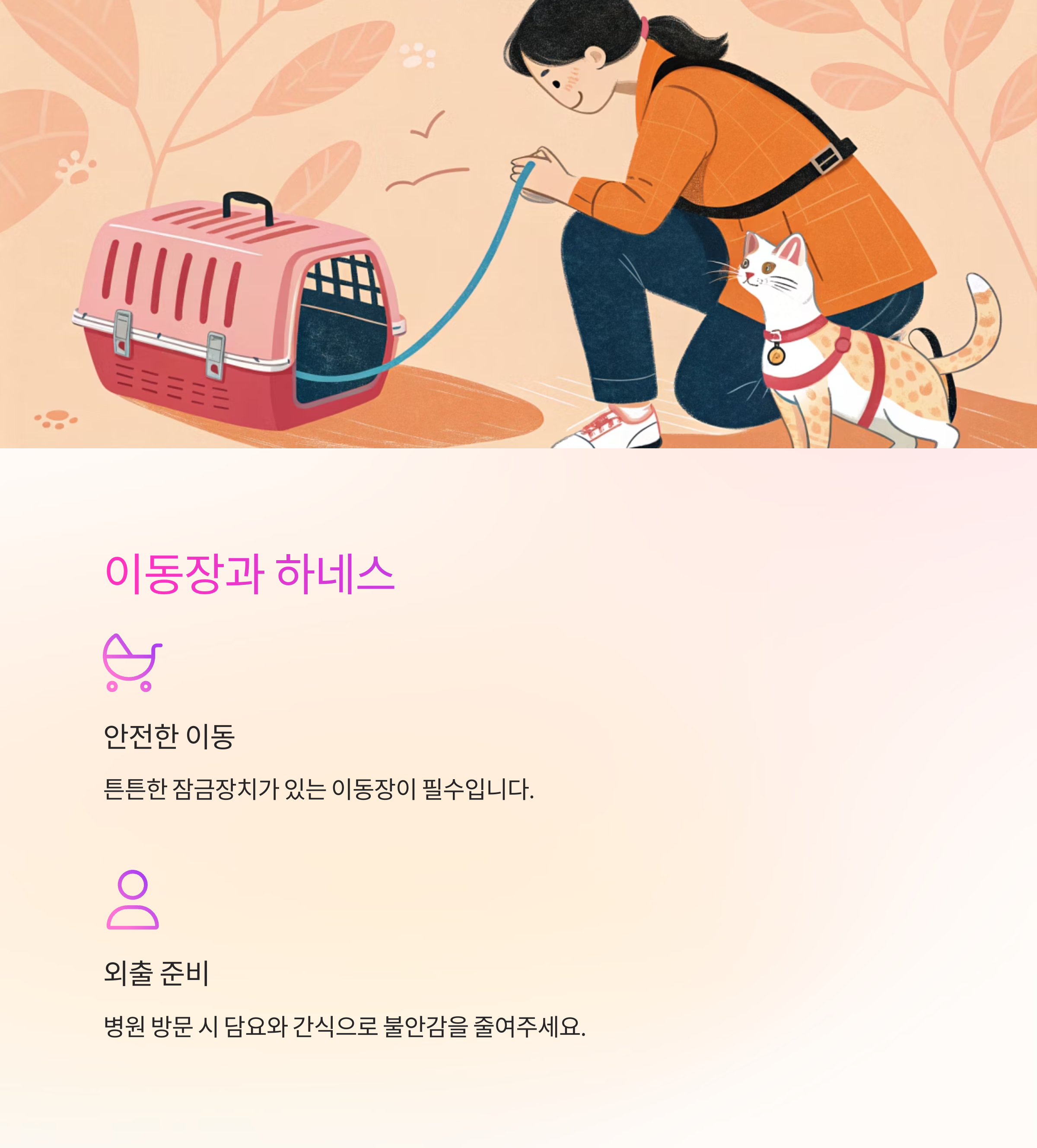 이동장과 하네스는 외출이나 병원 방문 시 필수입니다