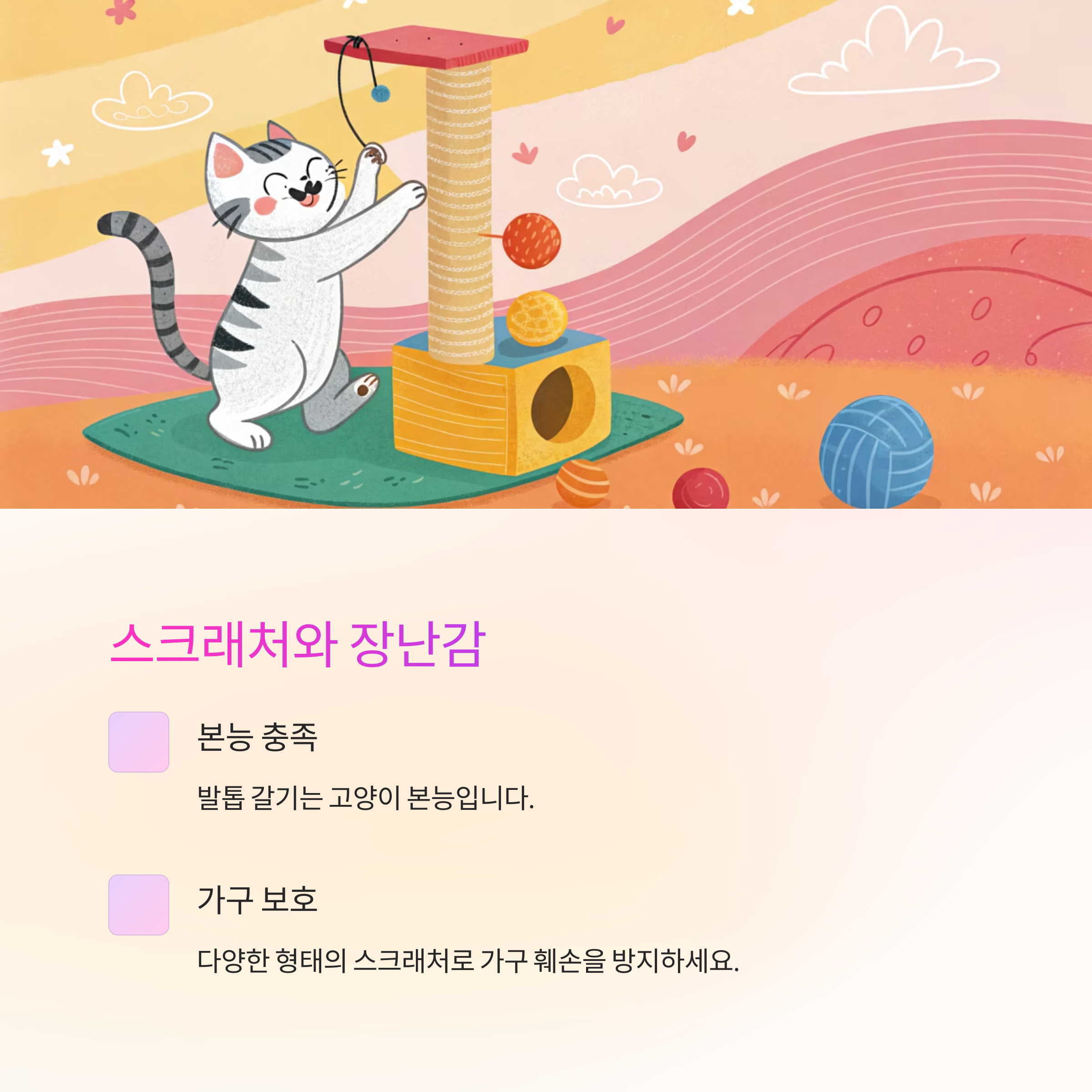 스크래처는 가구 훼손 방지에도 필수이고, 장난감은 스트레스 완화와 운동에 도움이 됩니다.