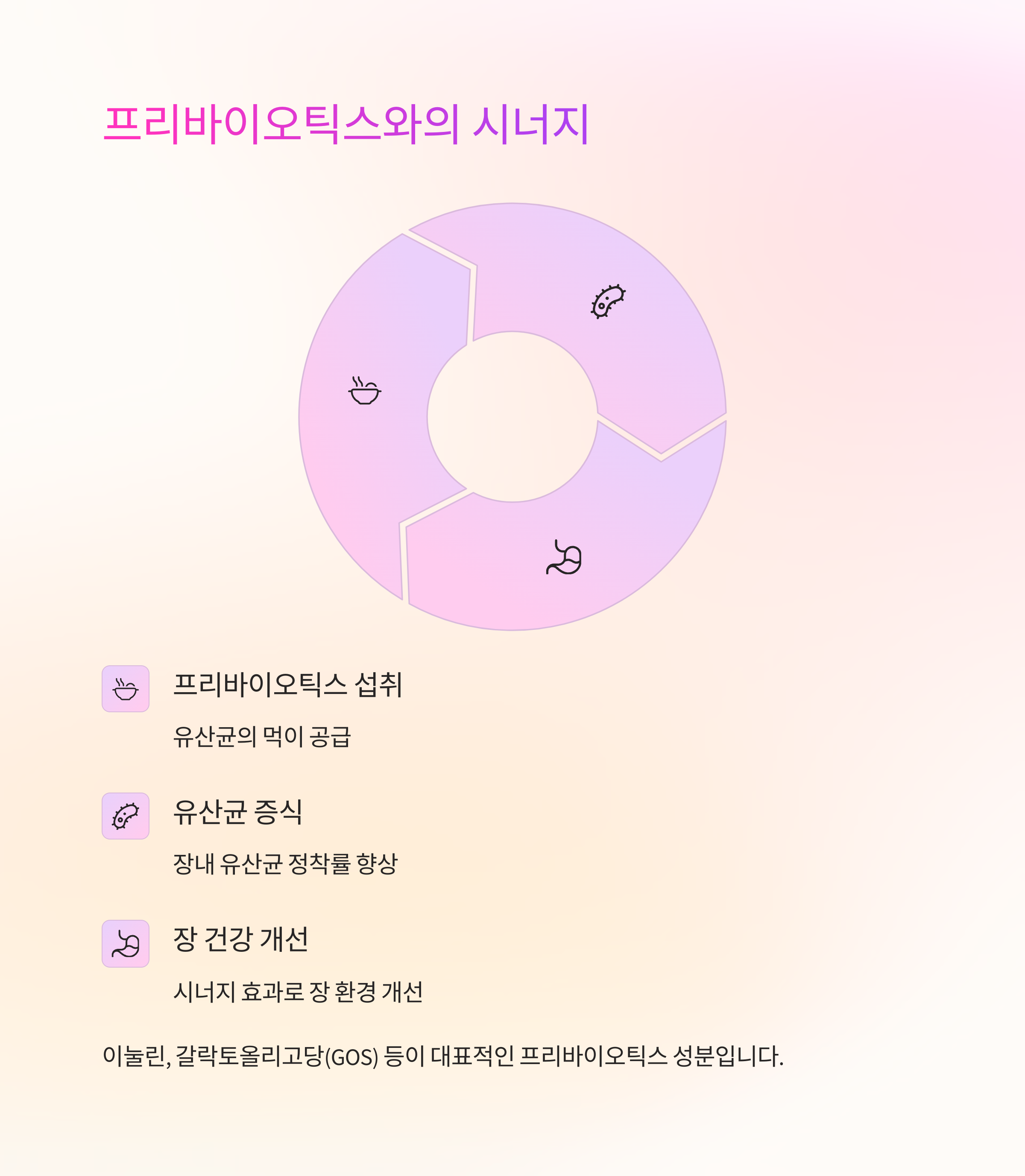 프리바이오틱스는 유산균의 먹이로, 함께 복용 시 장내 정착률이 높아집니다.