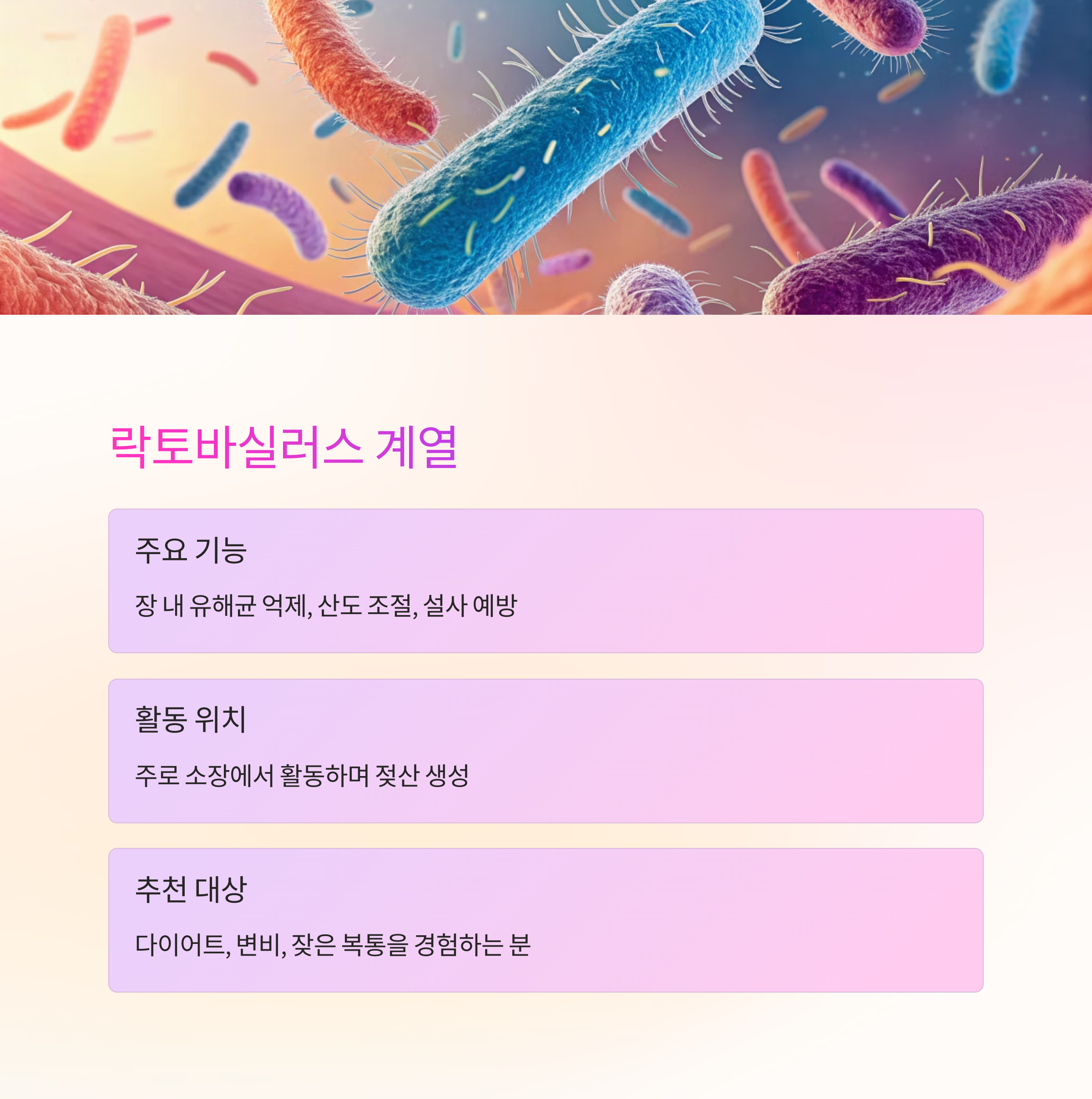 | 락토바실러스 계열 | 소장 | 소화, 유해균 억제, 가스 완화 |