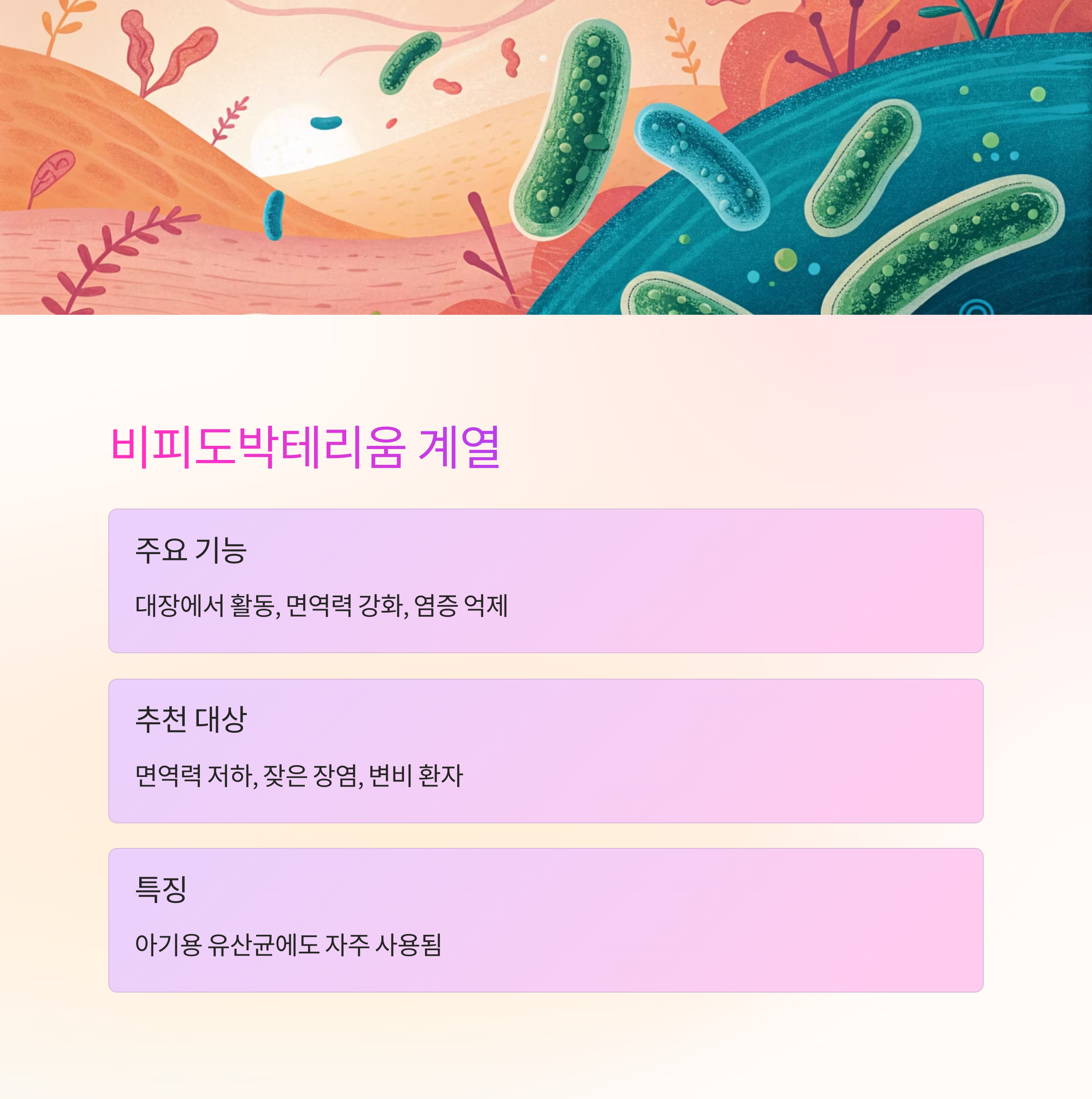 | 비피도박테리움 계열 | 대장 | 배변, 면역력, 장 염증 조절 |