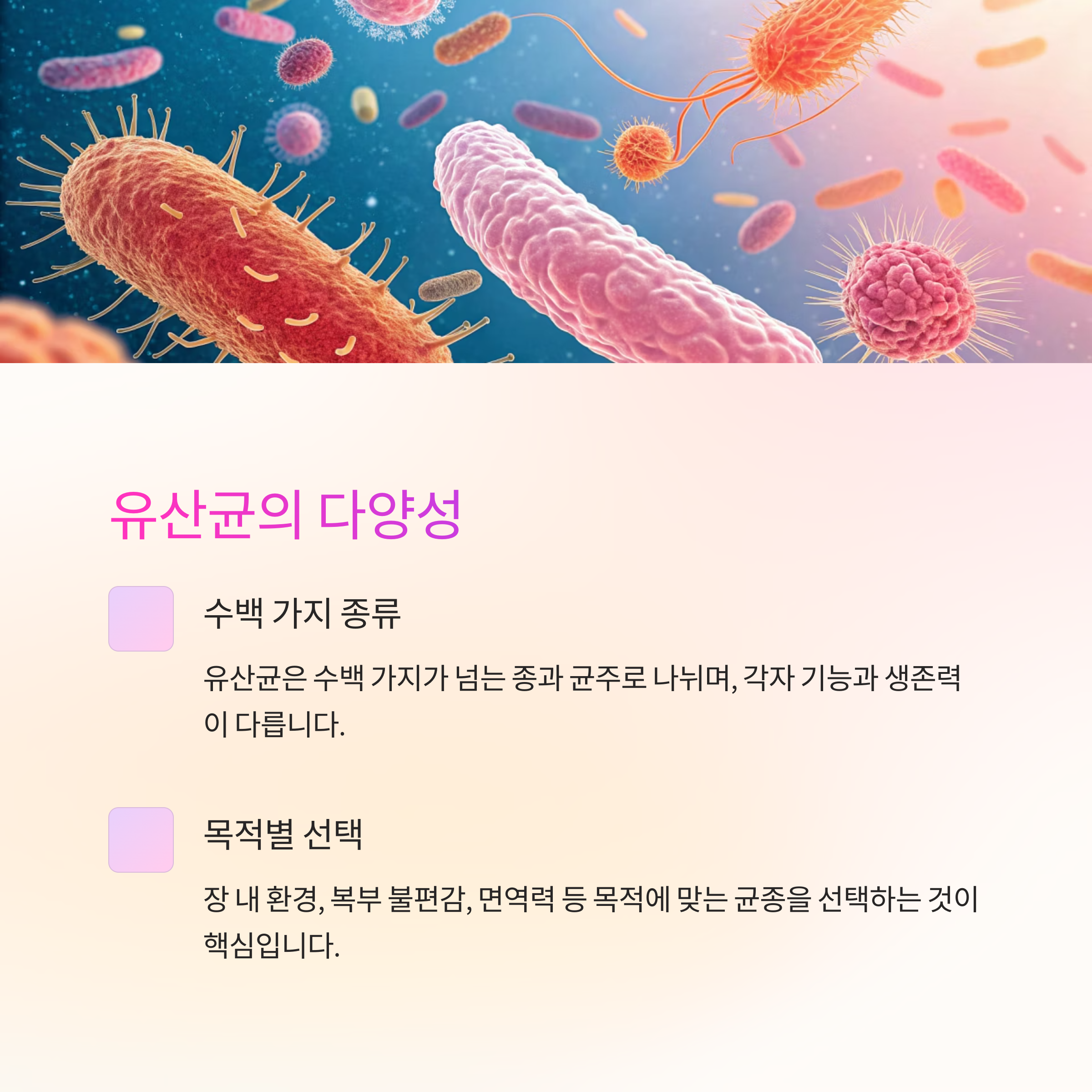 장 내 환경, 복부 불편감, 면역력 등 목적에 맞는 균종을 선택하는 것이 핵심입니다.