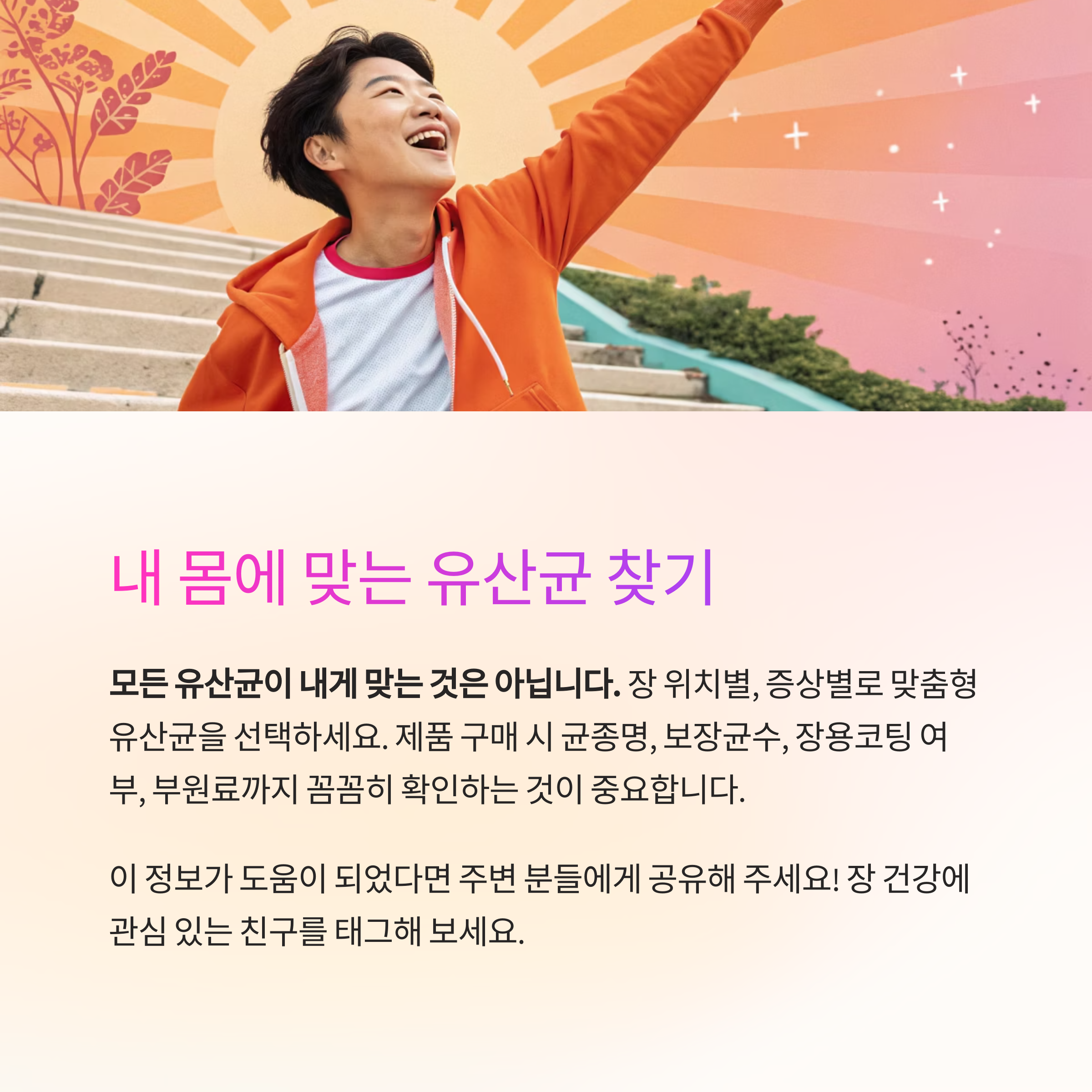 종류별 특징을 알고 내 몸에 딱 맞는 유산균을 선택하는 것이 중요합니다.