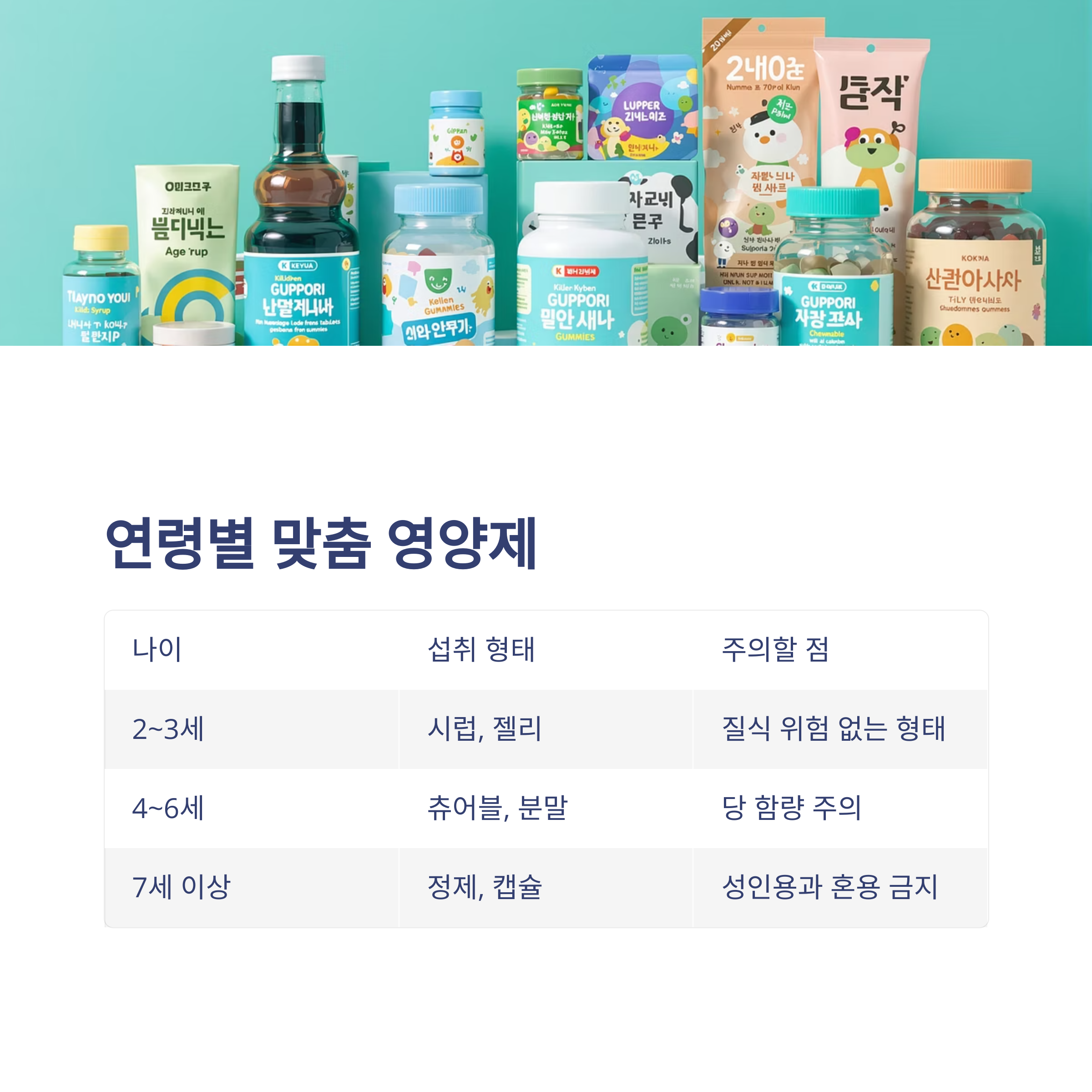 | 2~3세 | 시럽, 젤리 | 질식 위험 없는 형태 선택 |
