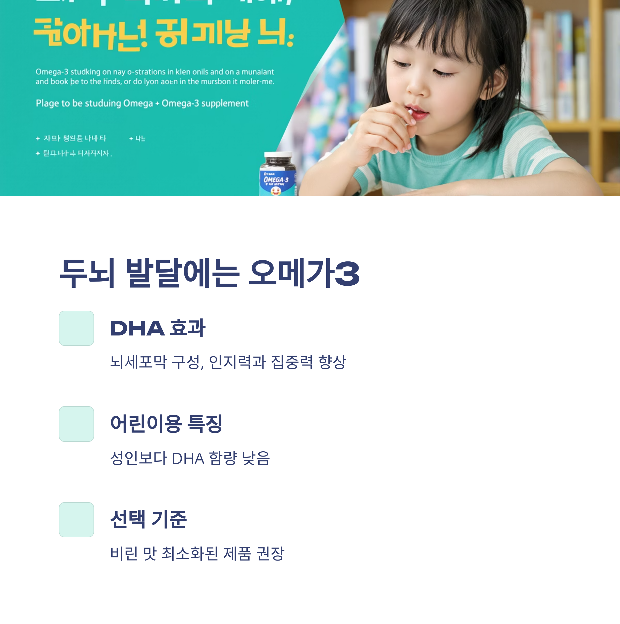 어린이용은 성인보다 DHA 함량이 낮으며, 비린 맛을 최소화한 제품을 선택하는 것이 좋습니다