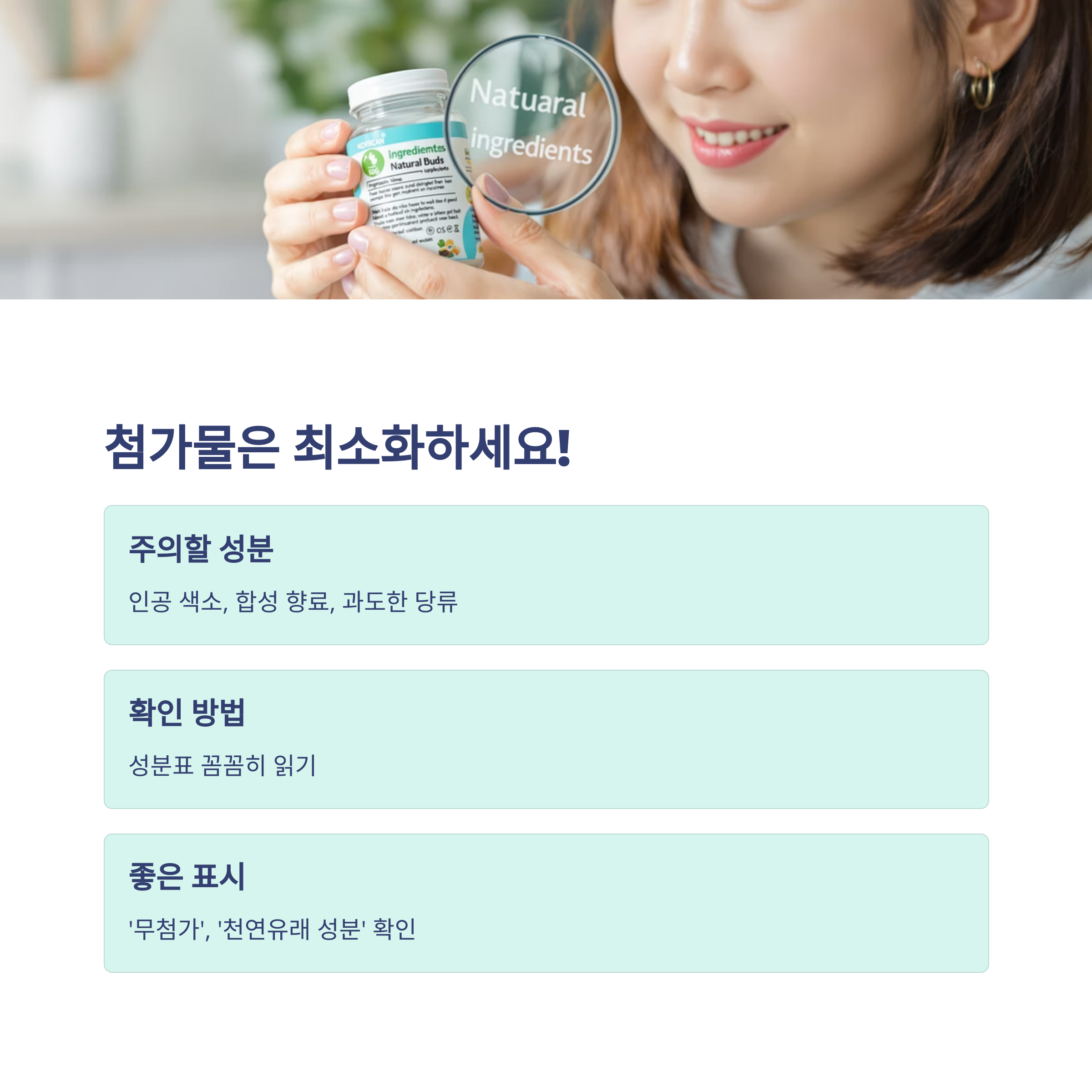 성분표를 꼼꼼히 확인하고 ‘무첨가’, ‘천연유래 성분’ 여부를 확인하는 것이 필요합니다