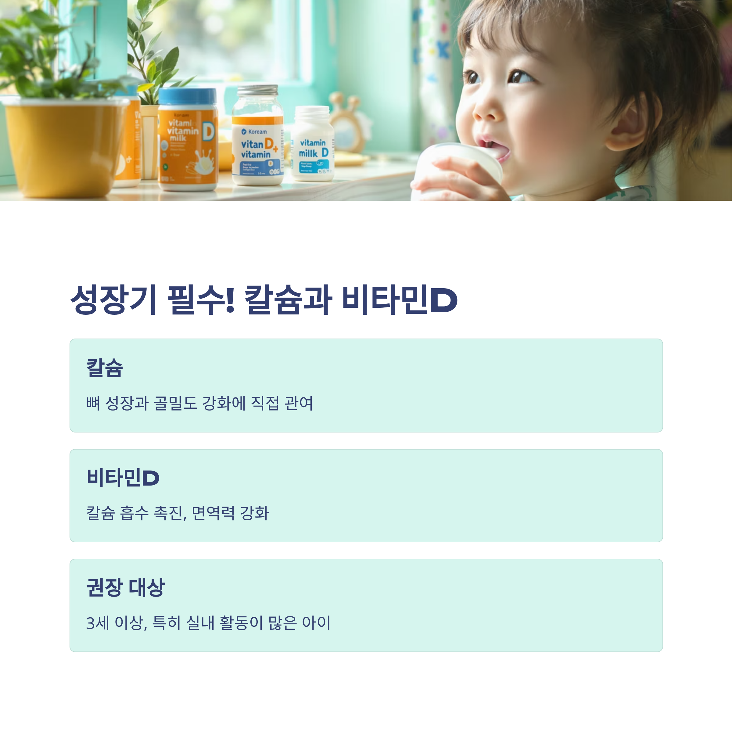 특히 실내 활동이 많아 햇빛 노출이 적은 아이라면 비타민D 보충이 필수입니다