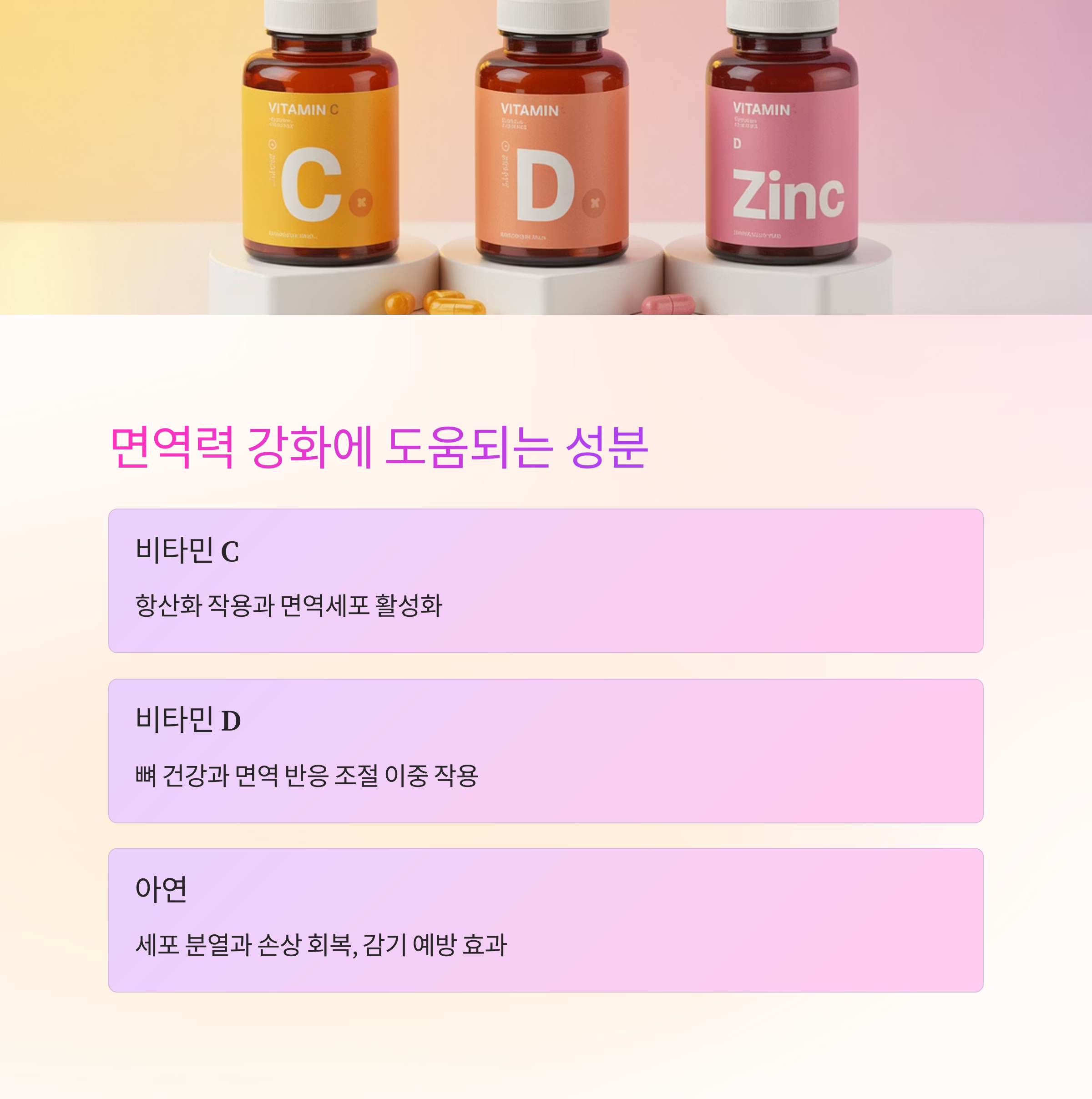 대표적인 성분으로는 비타민 C, 비타민 D, 아연이 있습니다.