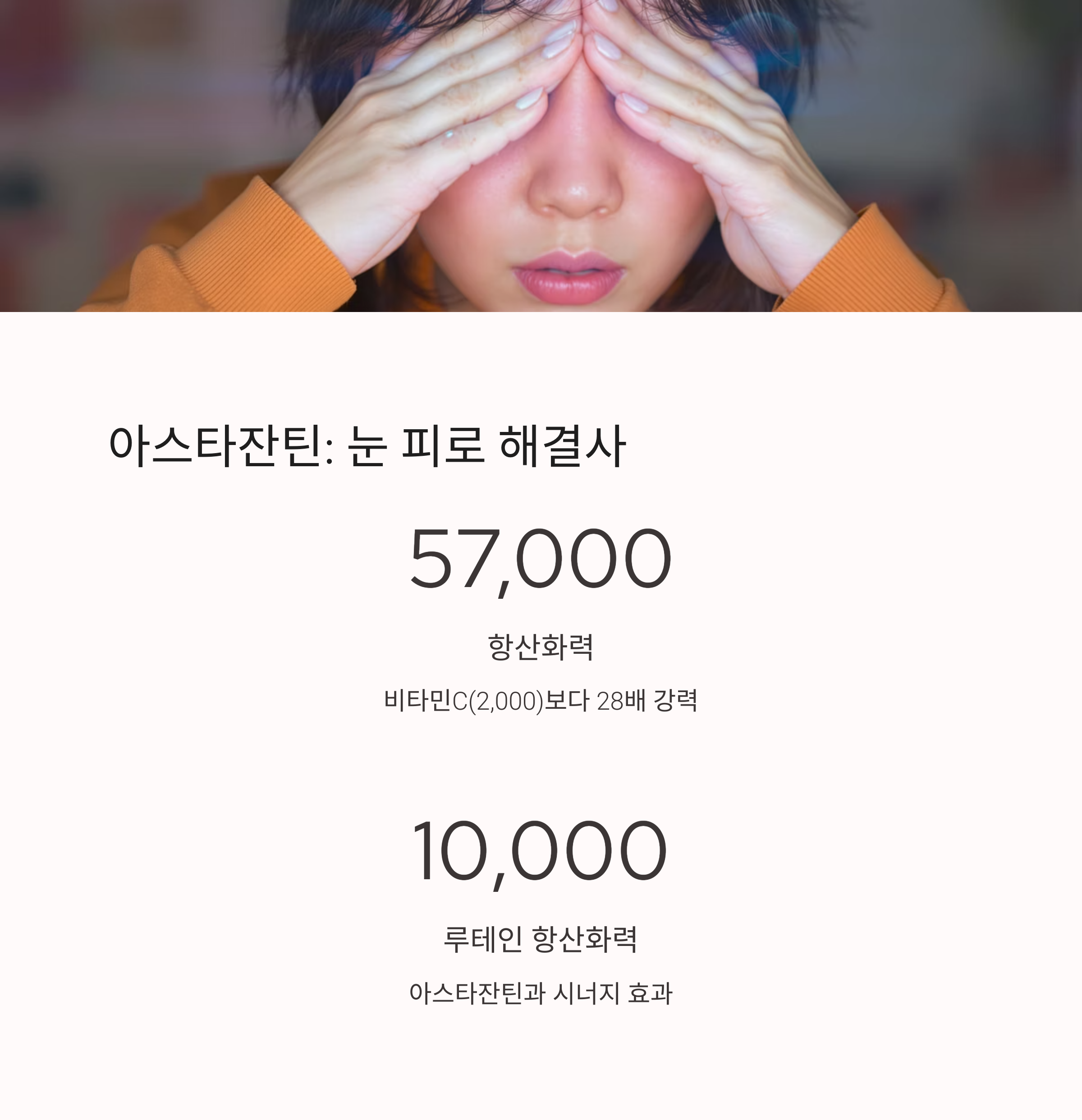 눈이 뻑뻑하거나 초점이 흐려지는 증상이 있다면, 아스타잔틴이 포함된 제품을 선택하세요.