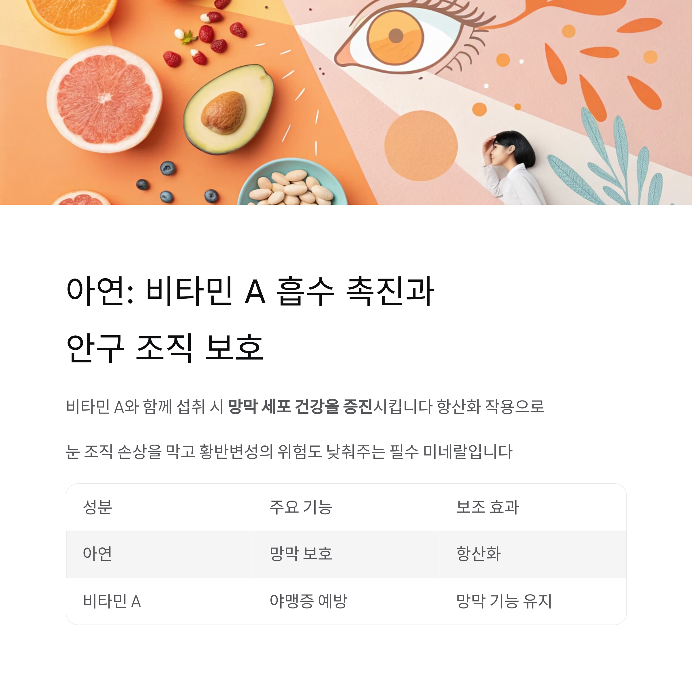 아연: 비타민 A 흡수 촉진과 안구 조직 보호