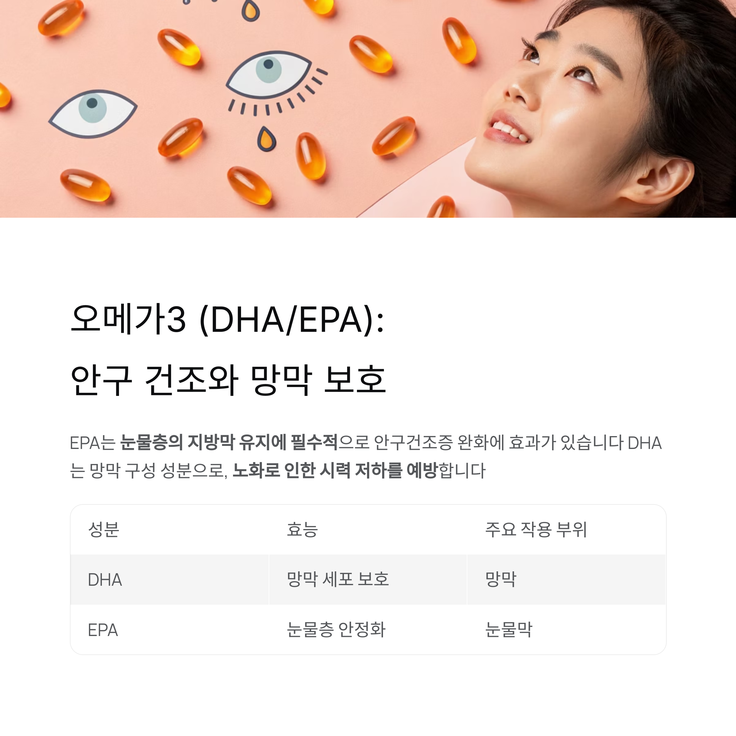 DHA는 망막 구성 성분으로, 노화로 인한 시력 저하를 예방합니다
