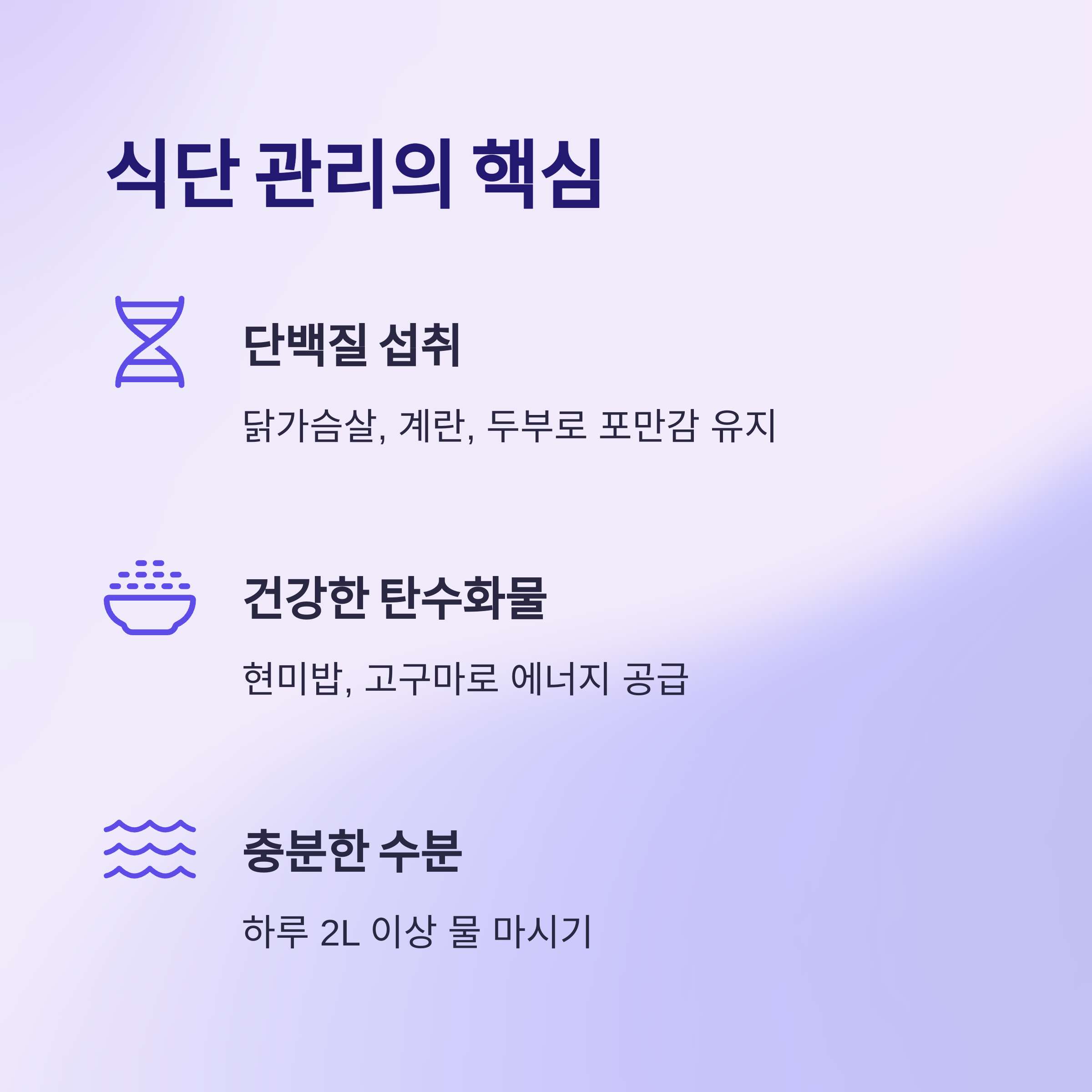 📊 식단 관리: 굶기보다 균형 잡힌 식사! 단백질, 건강한 탄수화물, 적절한 지방 섭취가 핵심입니다.