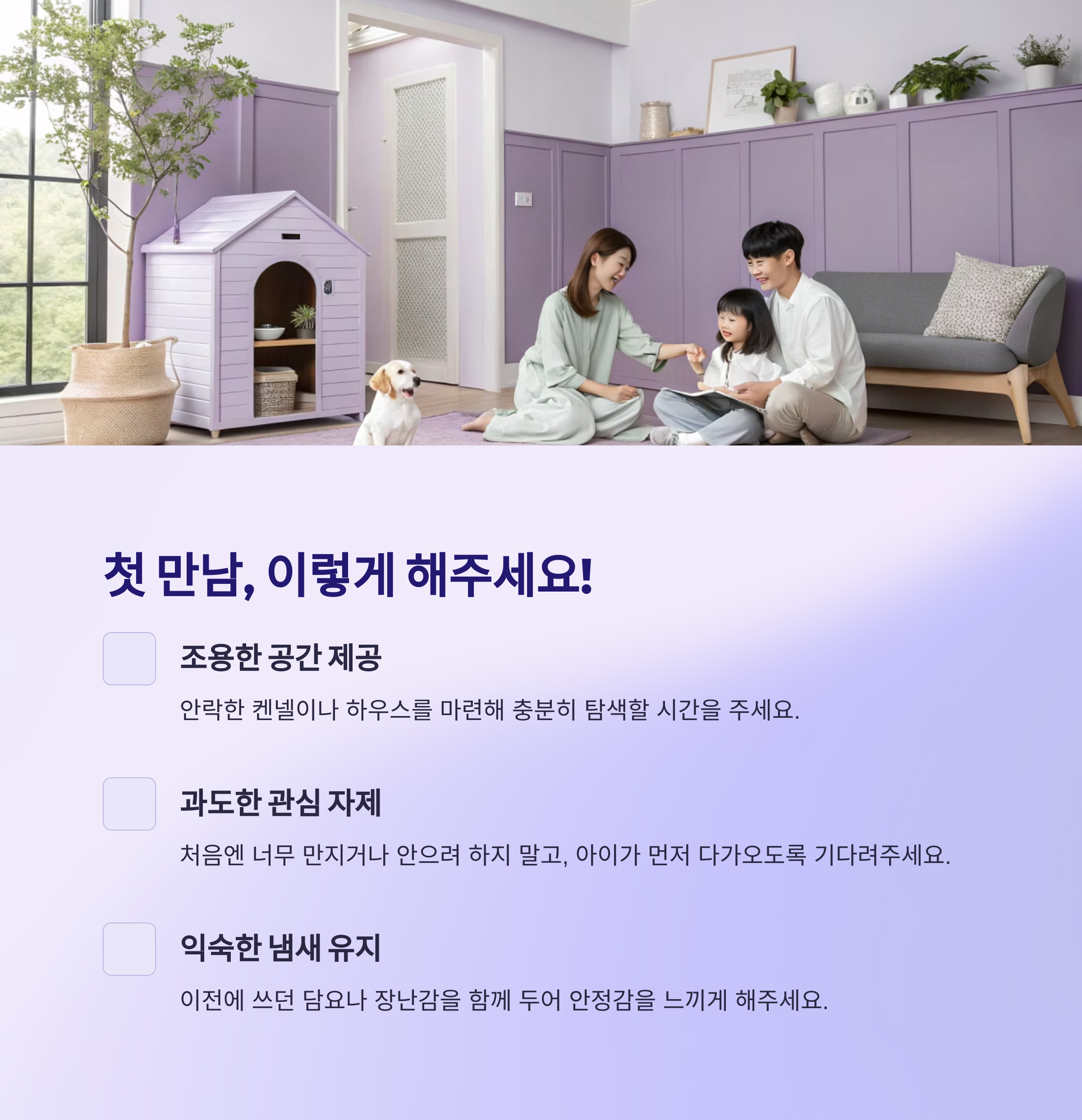 1. 적응: 조용한 공간 제공, 과도한 관심 자제, 냄새 적응으로 안정적인 첫 만남을 만들어주세요.