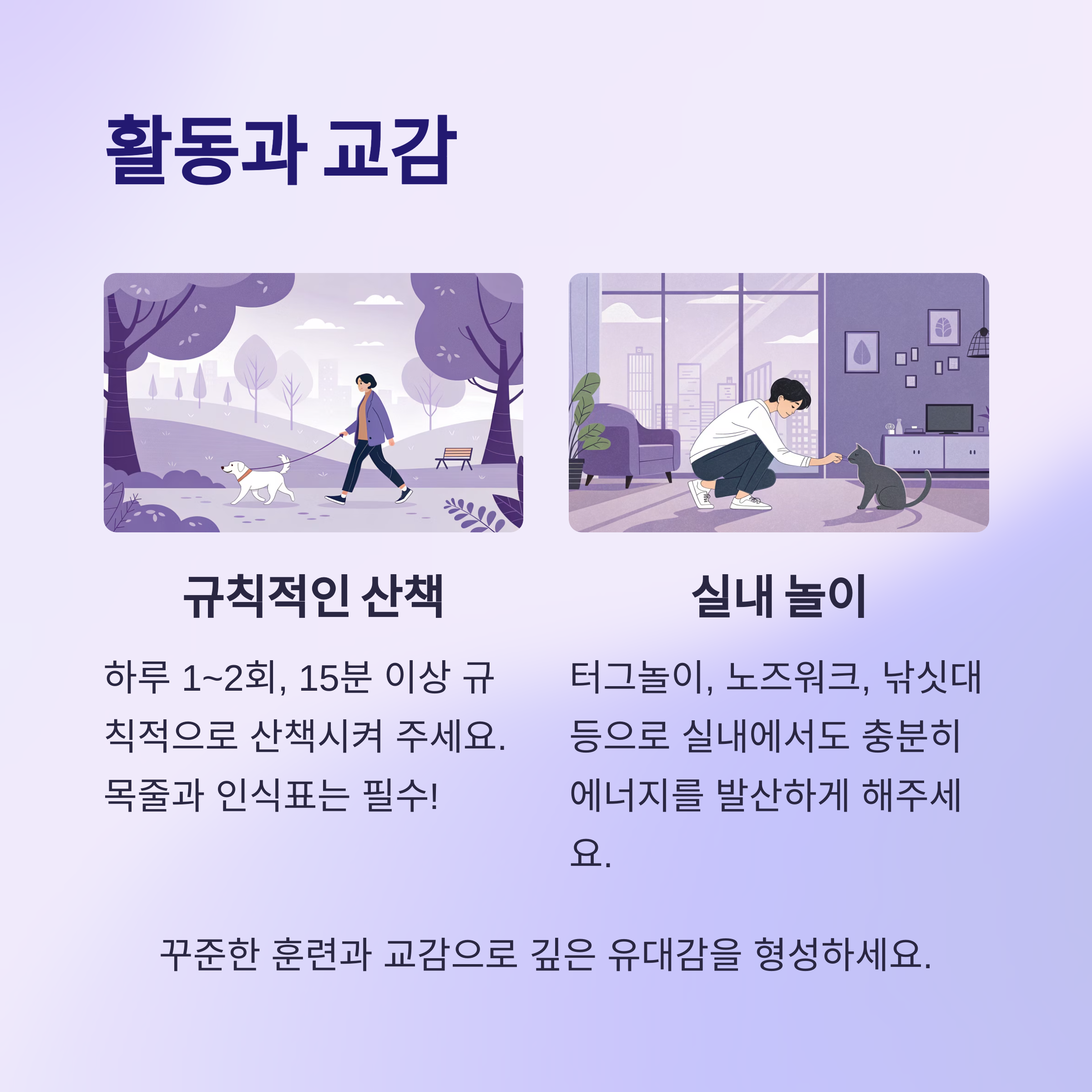 • 꾸준한 훈련: '앉아', '기다려' 등 기본적인 복종 훈련은 안전과 올바른 행동 형성에 필수적이에요.
