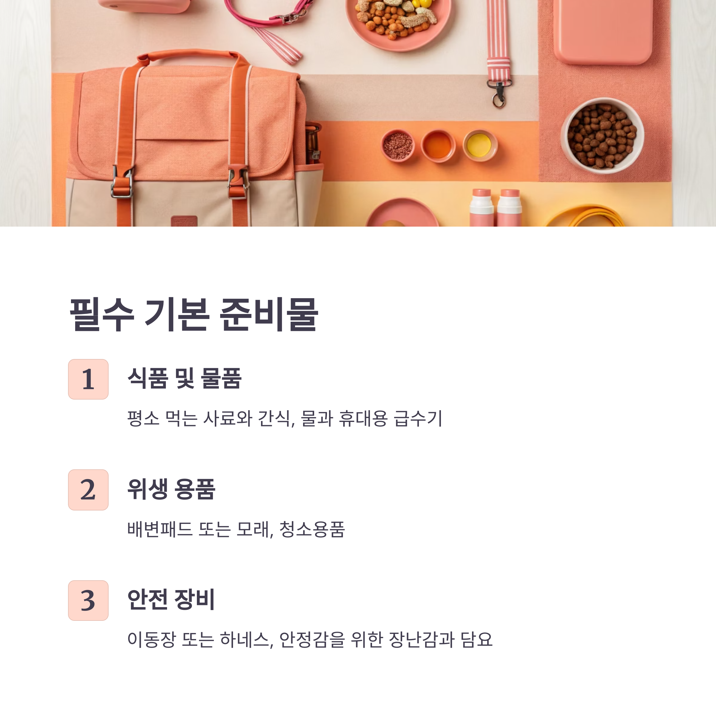 반려동물 여행에서 빠질 수 없는 기본 준비물은 아래와 같습니다.