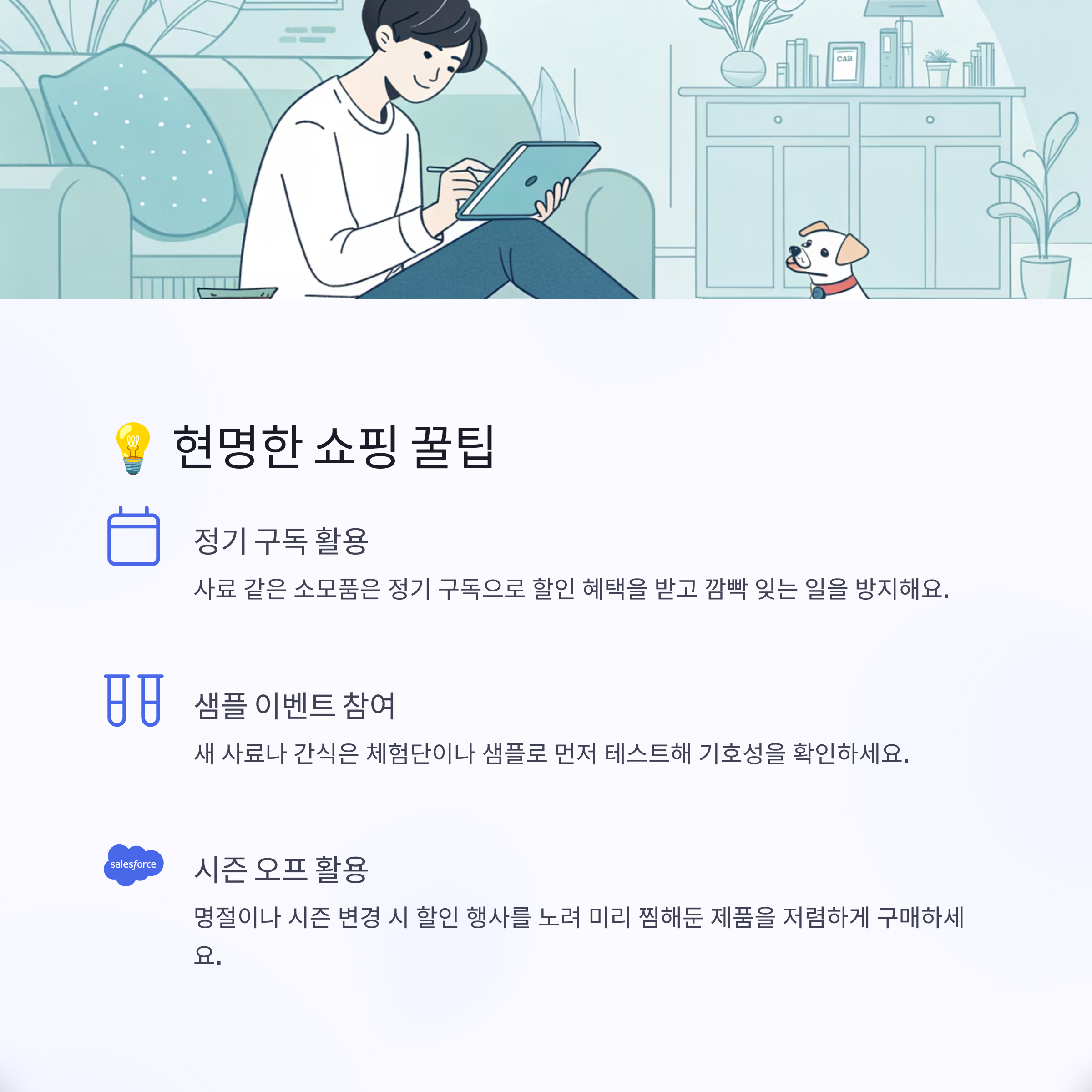 | 정기 구독 서비스 활용 | 사료처럼 매번 구매해야 하는 소모품은 정기 구독 서비스를 이용하면 할인 혜택을 받을 수 있고, 깜빡하고 못 사는 일을 방지할 수 있어요. |