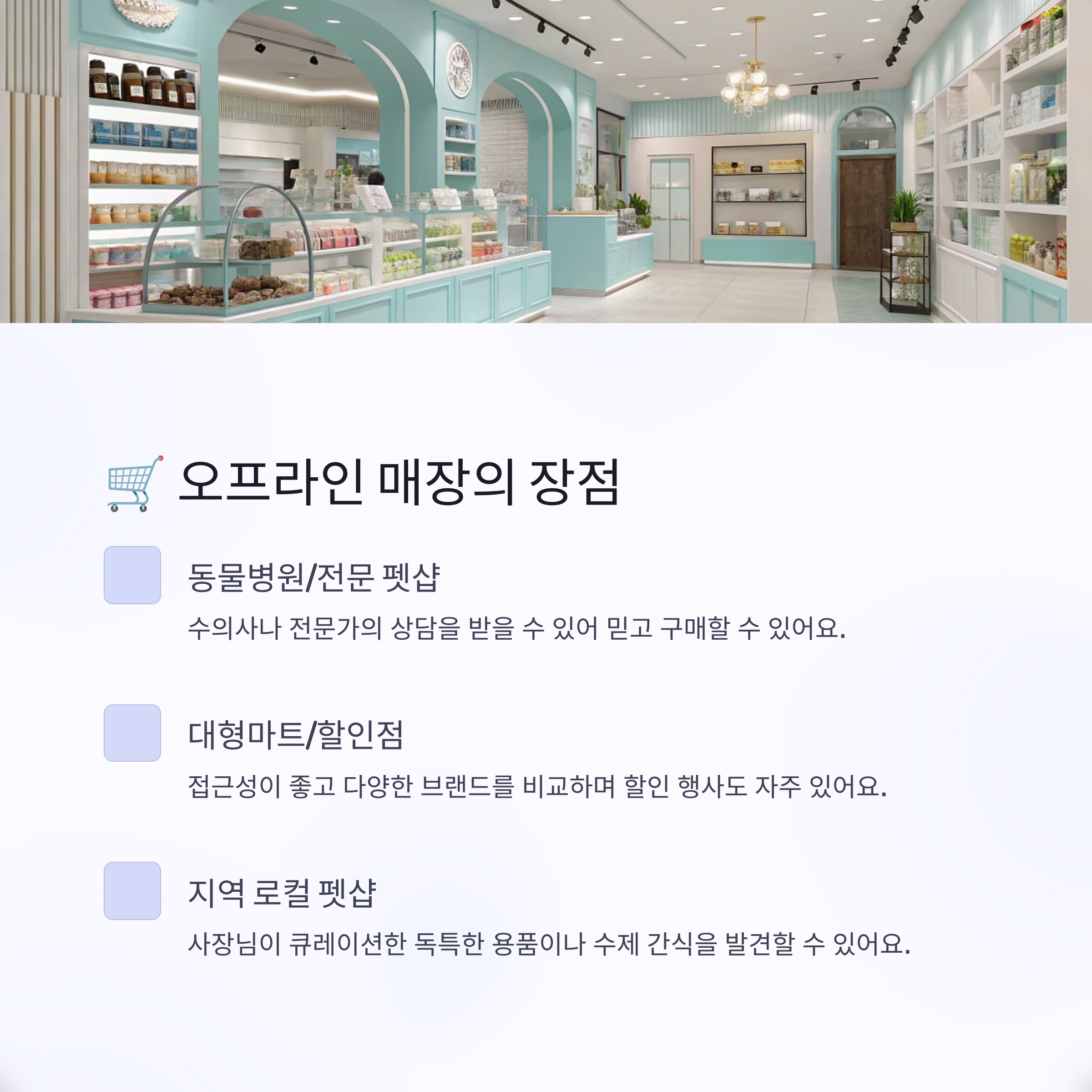• 동물병원/전문 펫샵: 수의사나 전문가의 추천을 받을 수 있고, 건강 상태에 맞는 사료나 영양제 등 전문적인 상담이 가능해요. 가격은 좀 비쌀 수 있지만, 믿고 살 수 있다는 장점이 크죠. 특히 처음 반려동물을 키우는 분들께 추천해요!