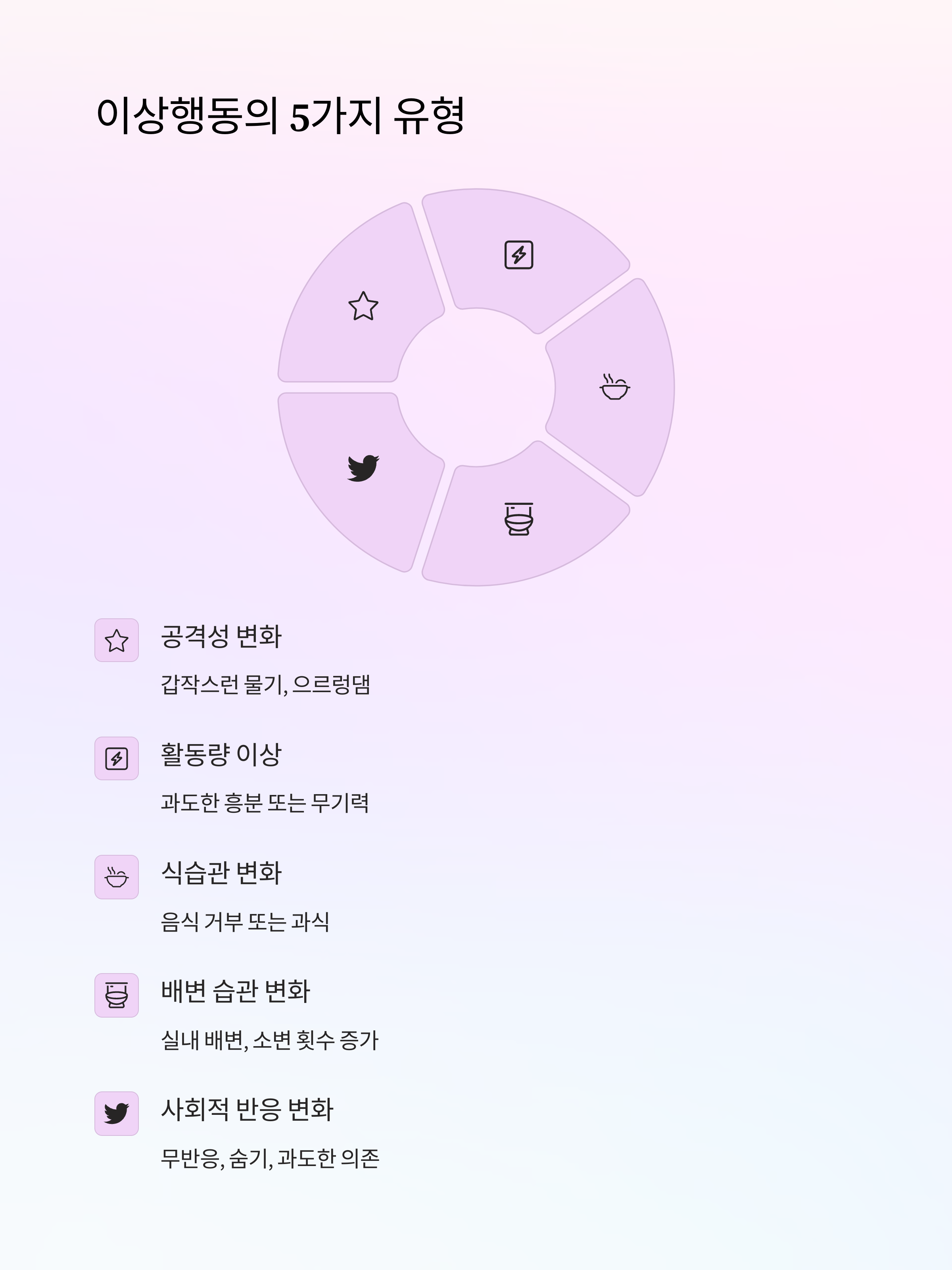 | 배변 습관 변화 | 실내 배변, 소변 횟수 증가 등 |