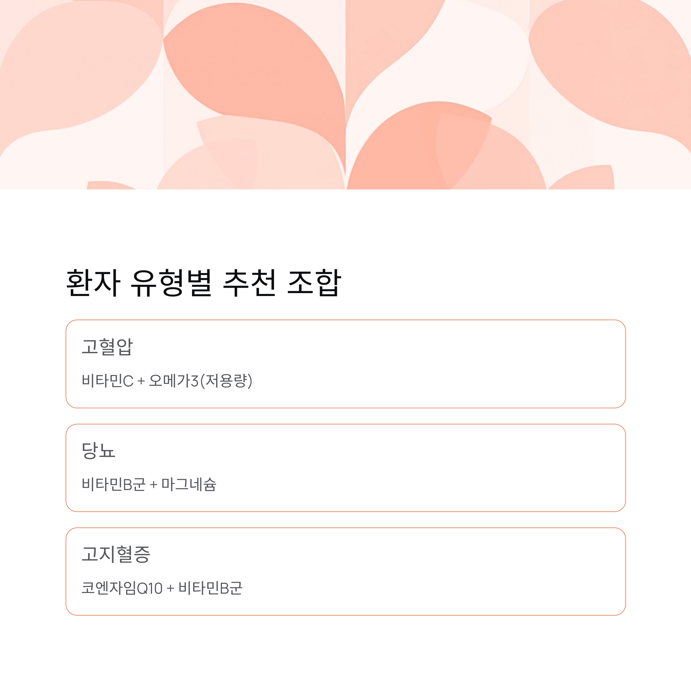 | 고혈압 환자 | 비타민C + 오메가3(저용량) |