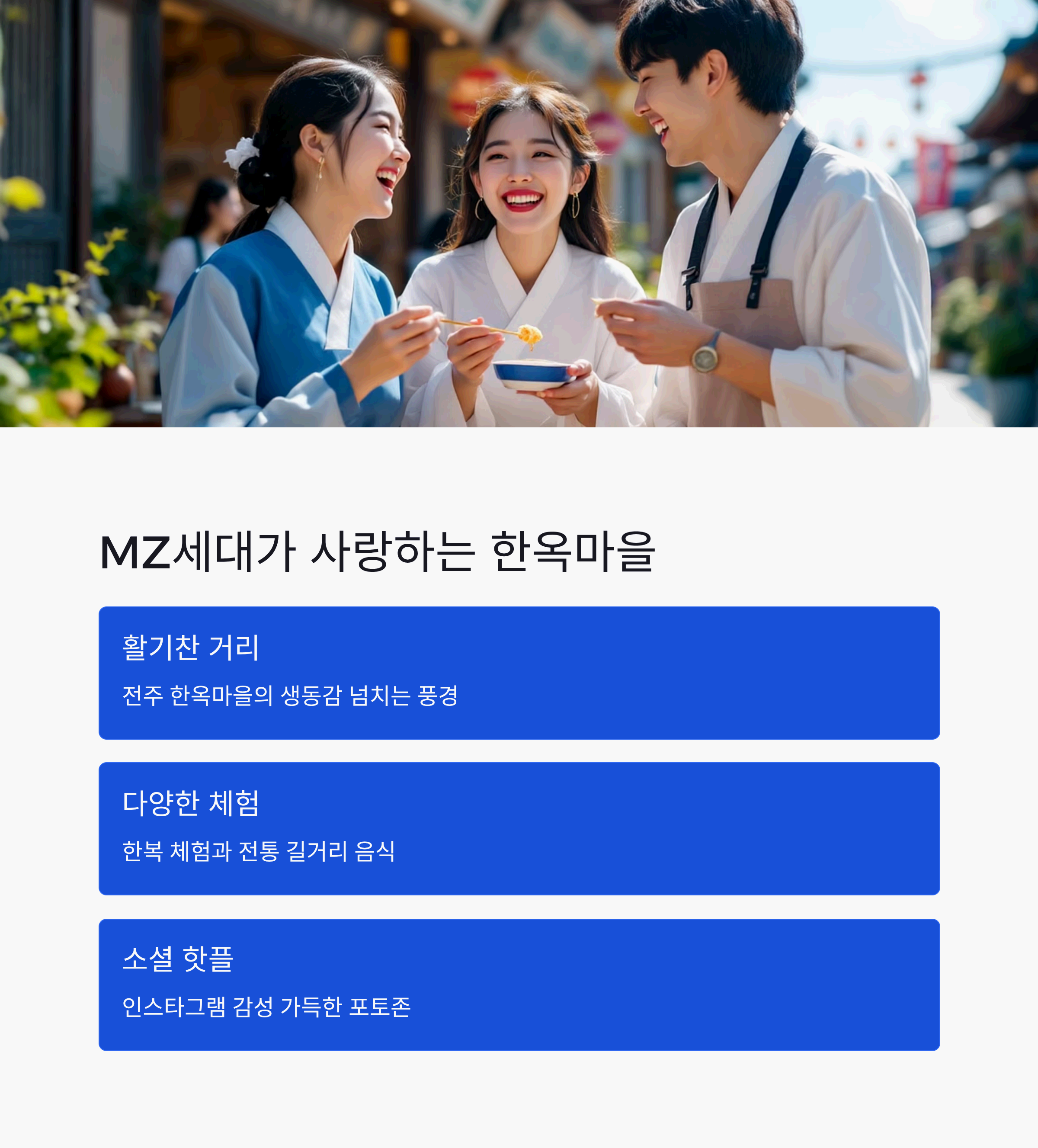 | 전주 한옥마을 | 다양한 즐길 거리, 활기찬 분위기 | 체험형 여행자, 친구/커플 |