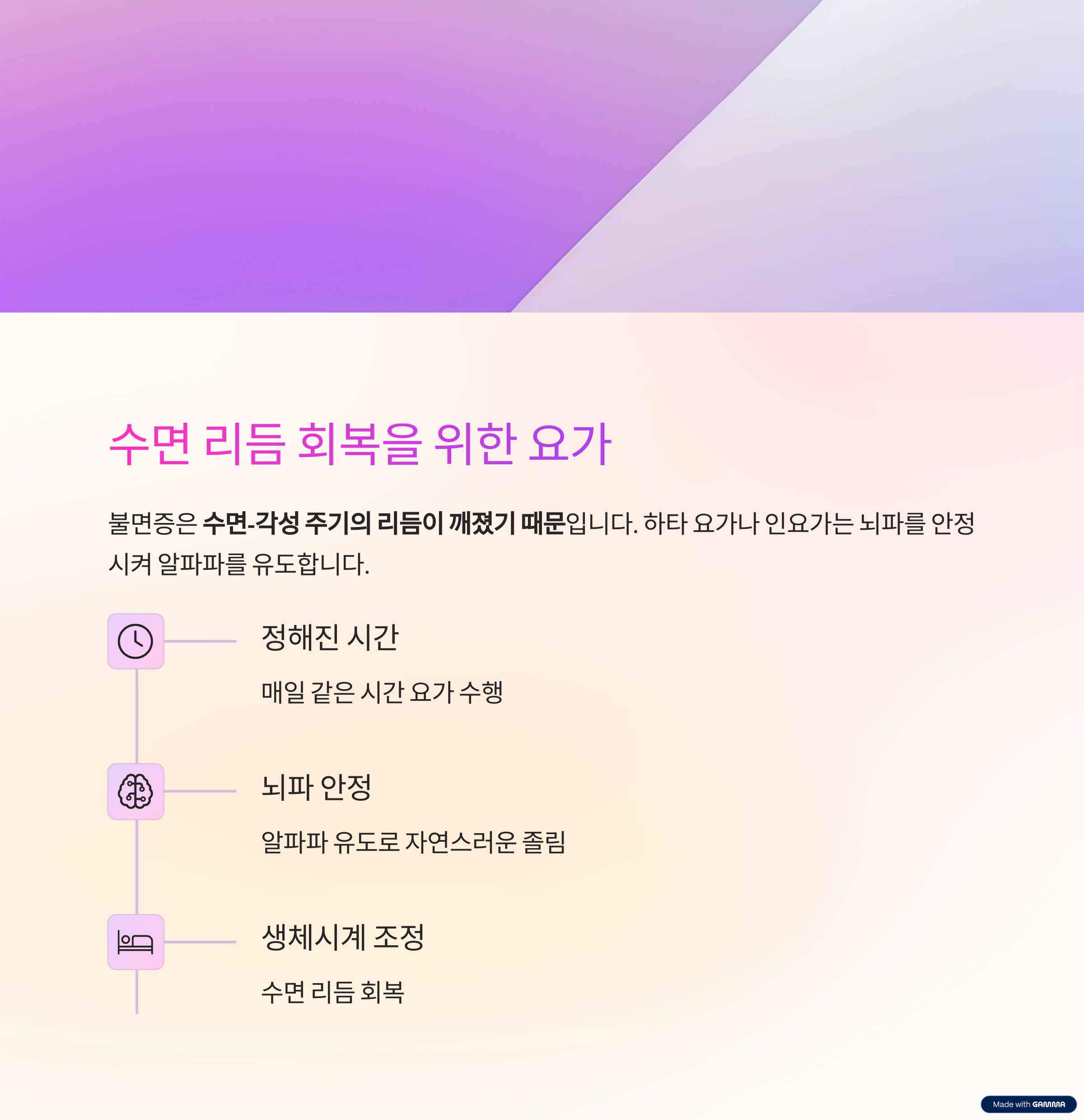 신경계 안정, 멜라토닌 분비 증가, 수면 유도 호흡 등 다양한 요소들이 요가로 인해 향상됩니다.