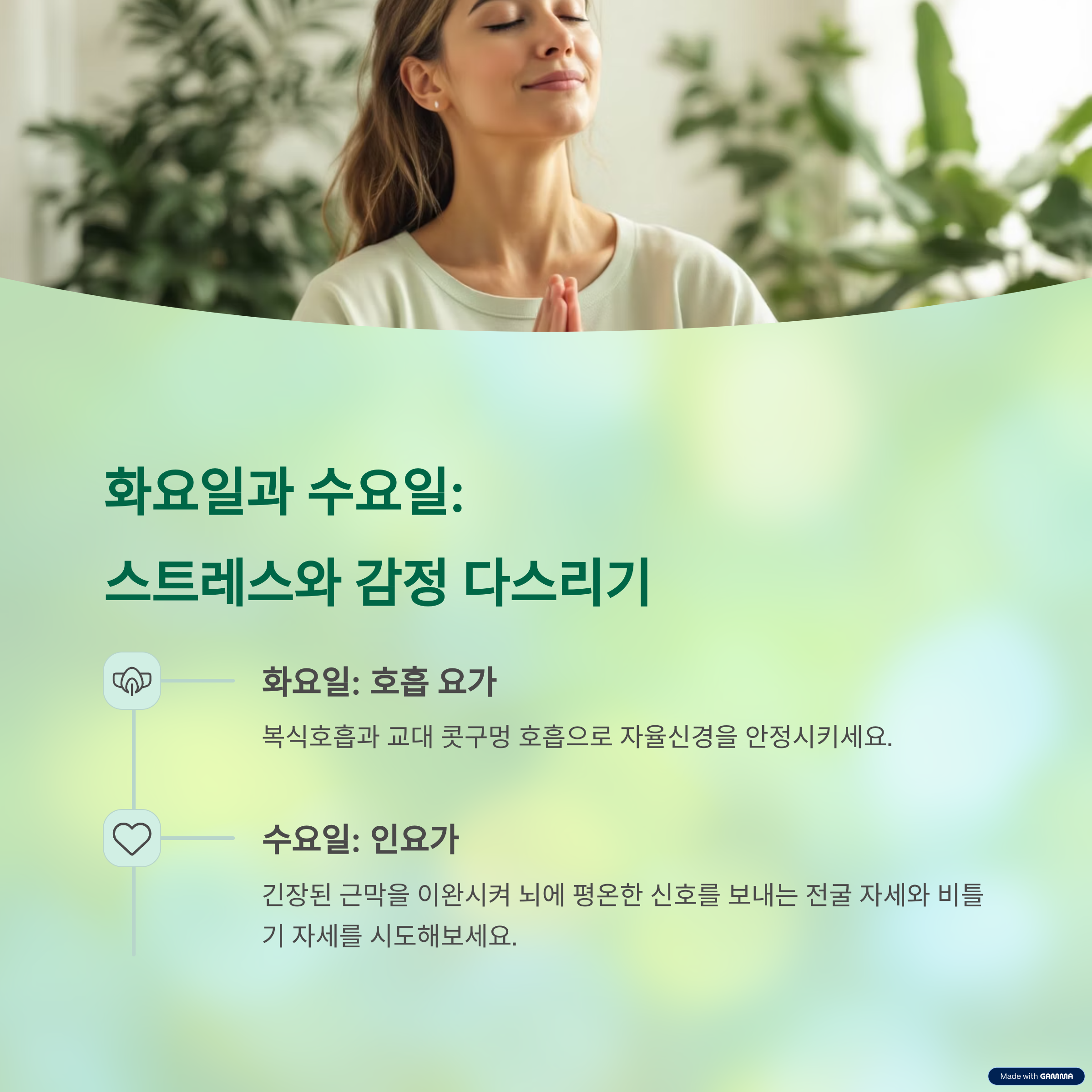 | 화 | 호흡 요가 | 15분 | 교대호흡, 복식호흡 | 스트레스 해소 |