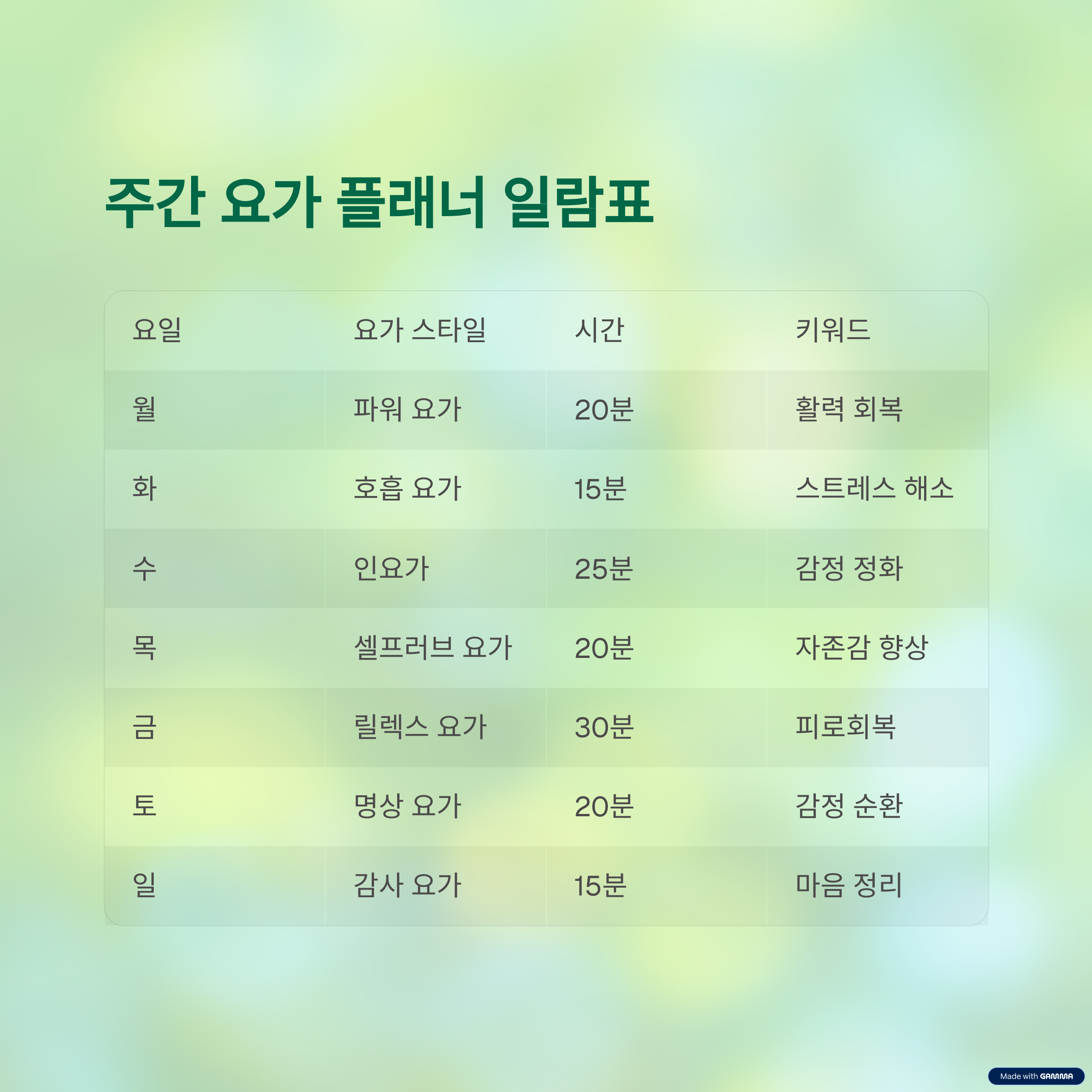 각 요일마다 정서적 목표를 설정하고, 그에 맞는 요가 테마를 정하면