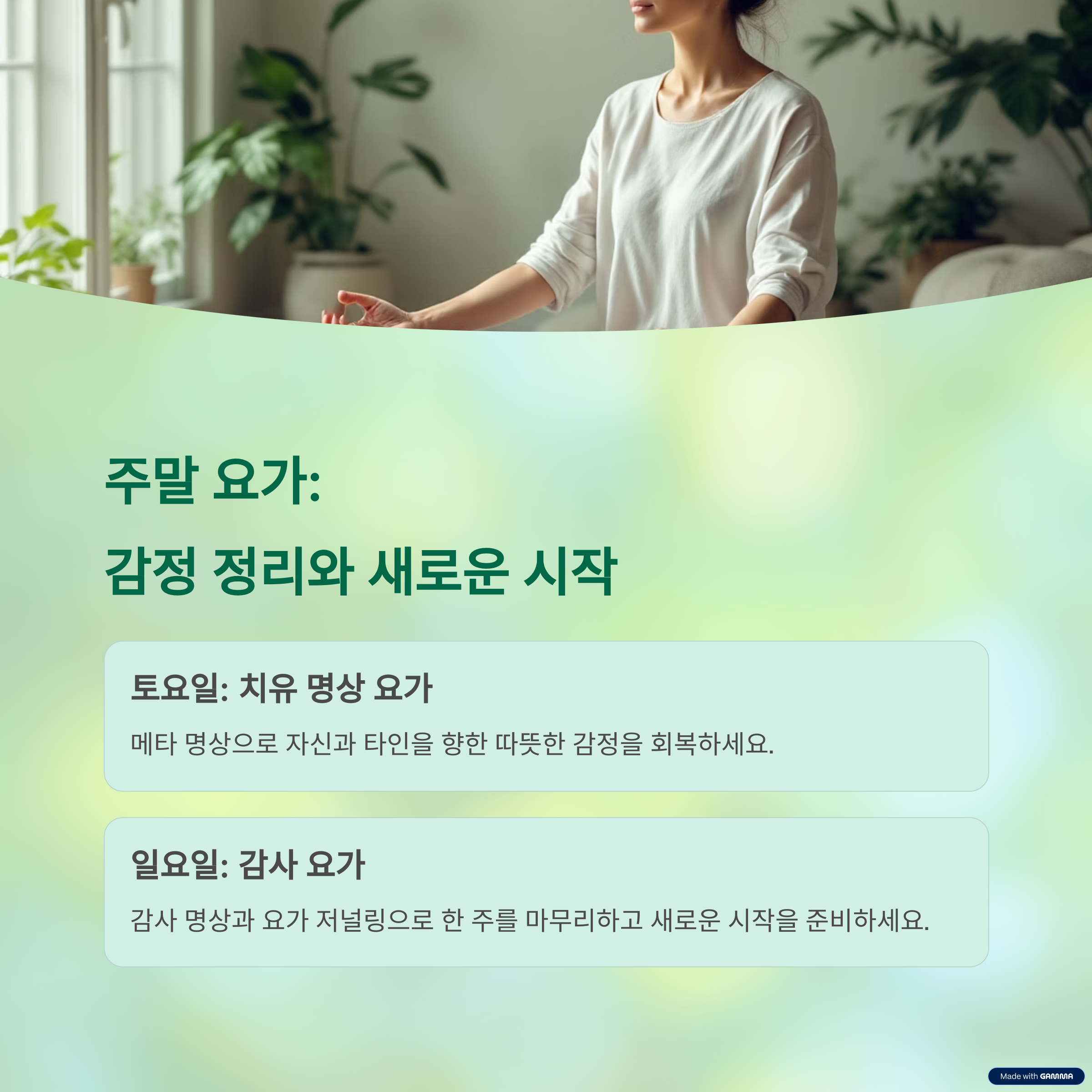 | 일 | 감사 요가 | 15분 | 명상+저널링 | 마음 정리 |