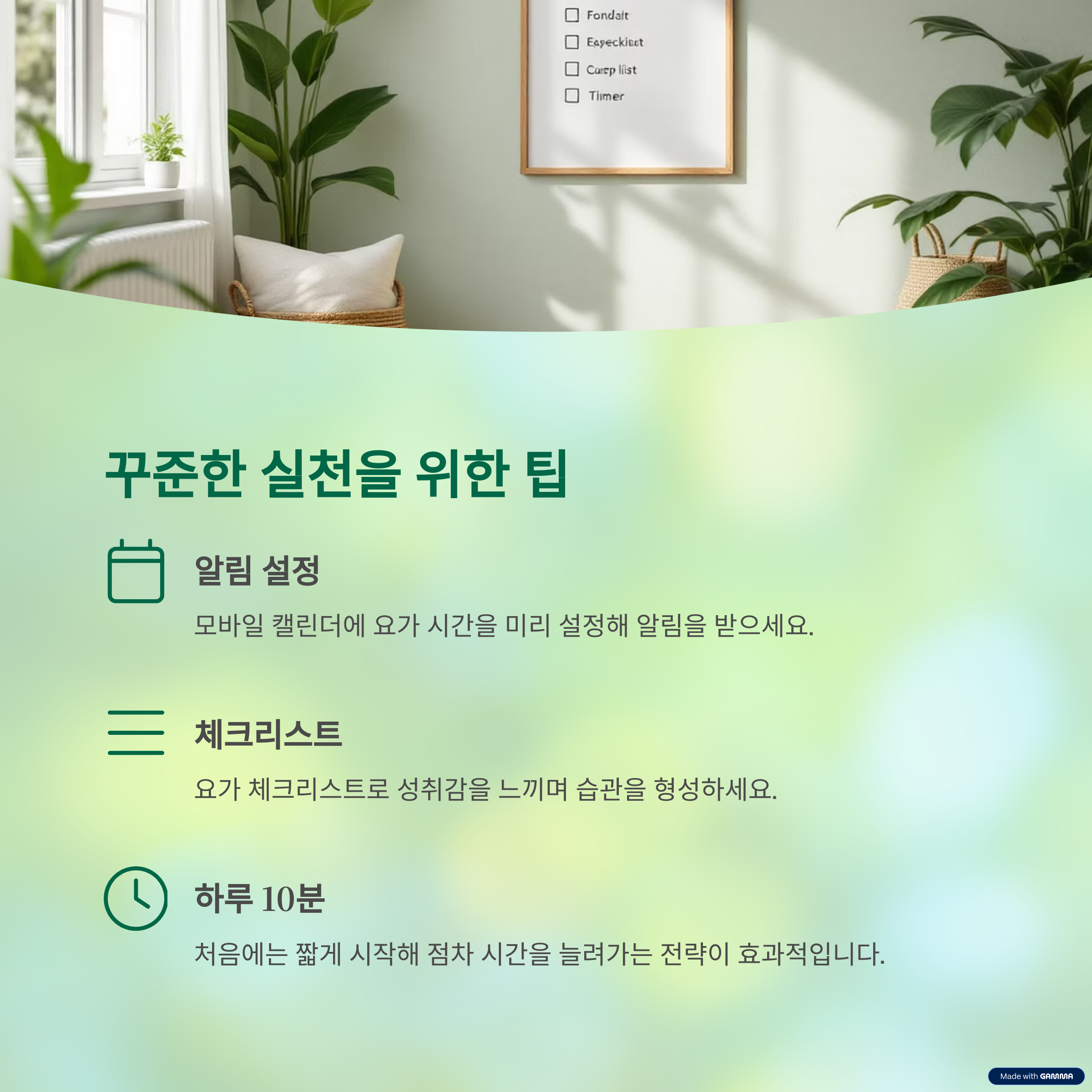 모바일 캘린더 알림, 요가 체크리스트, 하루 10분만 시작 등