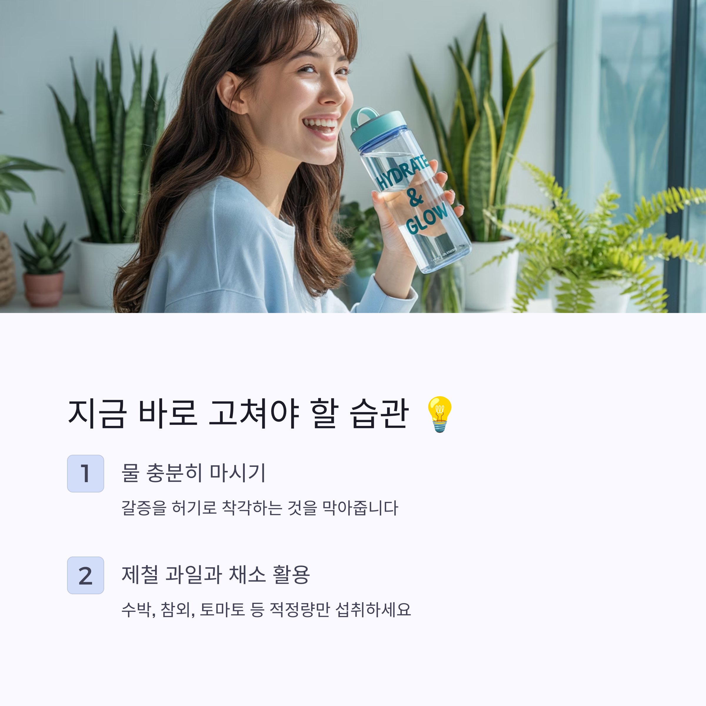 - 탄산/단 음료 NO! 🚫: 물을 충분히 마시고, 수분 가득한 제철 과일/채소를 적절히 활용하세요.